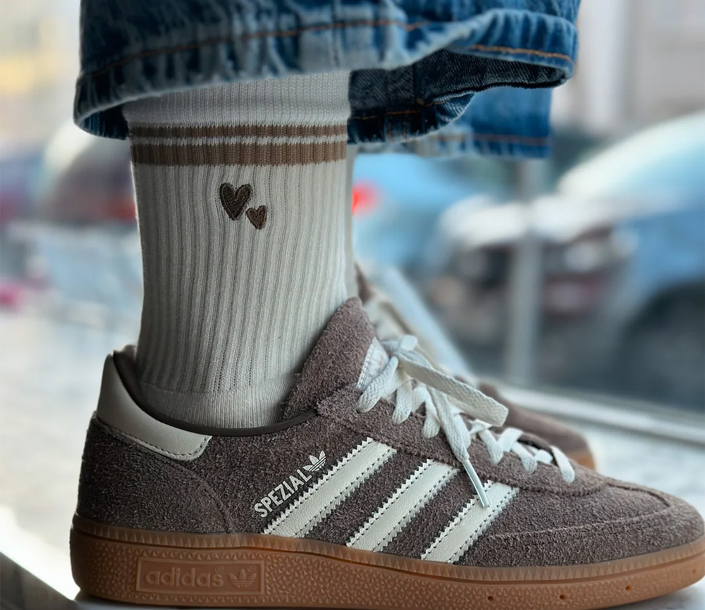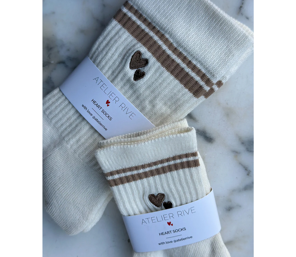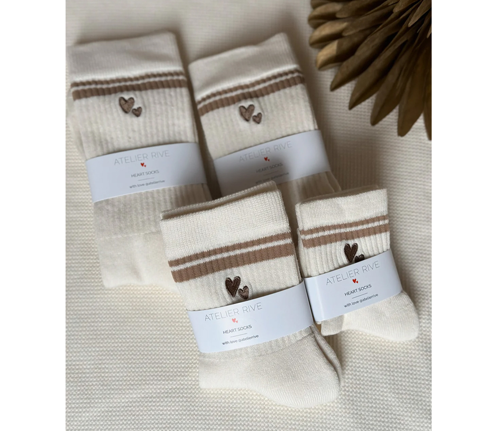 Extra weichen Herz-Socken für Babies, ideal für den perfekten Mama Baby Partnerlook und Papa Baby Partnerlook. Ein kleines hellbraunes Herz-Logo ist am Knöchel eingestickt und diese süßen Socken passen hervorragend zu allen anderen Partnerlook-Styles aus unserer Collection. Heart Socks mit coolem Streifen-Design. Die gerippten Partnerlook Socken haben eine softe, verstärkte Sohle mit gewebtem beigem „AR“ unter dem Fuß.