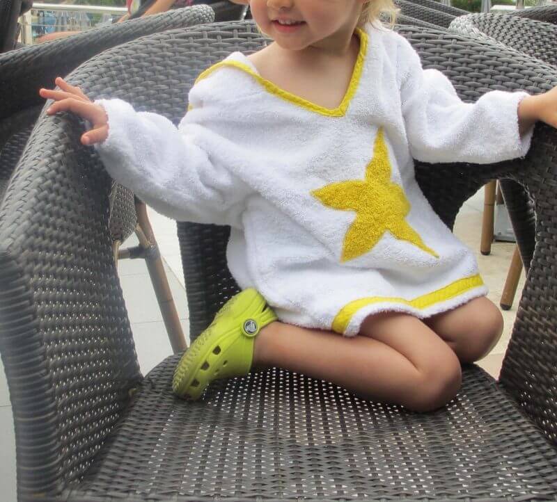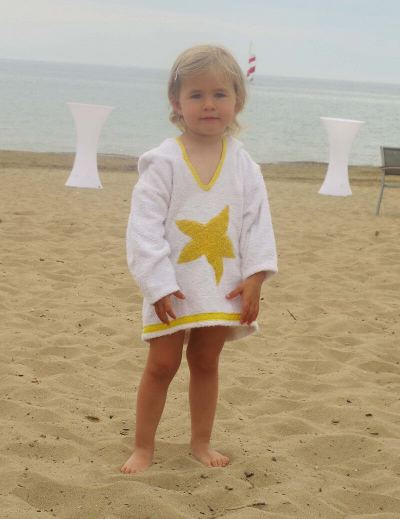 Dieses Kleid ist sehr einfach zu nähen und ist zudem auch noch sehr praktisch. Ob im Schwimmbad oder am Strand, das Teil ist vielseitig zu gebrauchen und kann aus unterschiedlichsten Stoffen genäht werden. Es gibt die Option das Kleid mit einer aufgesetzten Tasche oder Seestern Applikation zu nähen. Den Frotteestoff gibt es hier.