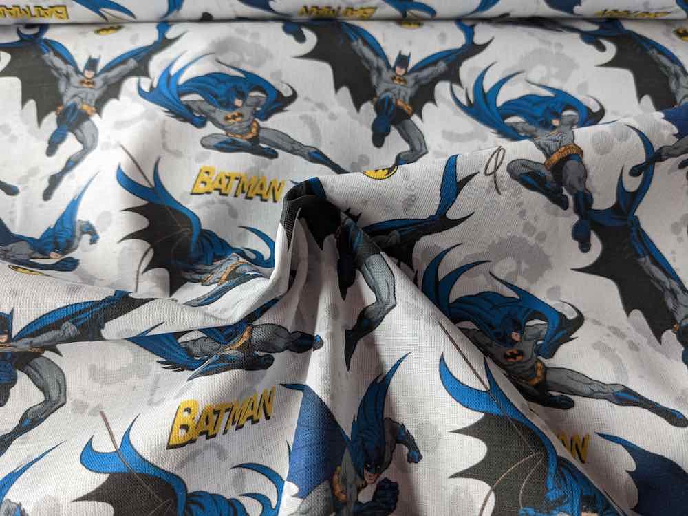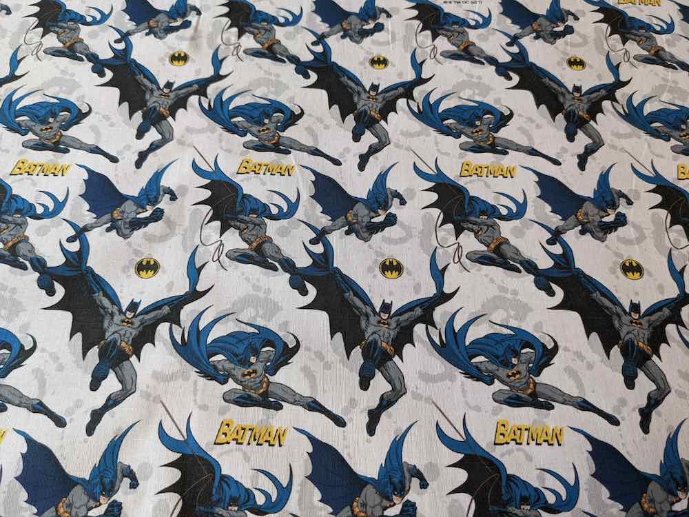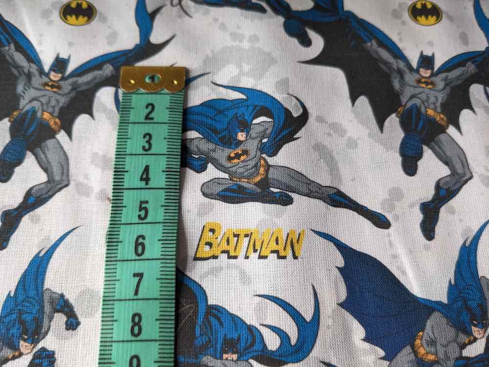 Ein hochwertiger Baumwollstoff mit Batmanl Motiven. Das Jeans Material ist ideal für Hosen, Röcke, Kleider, Mützen und vieles mehr.