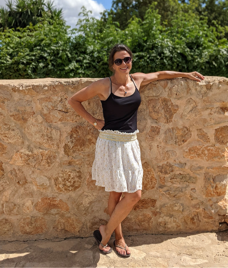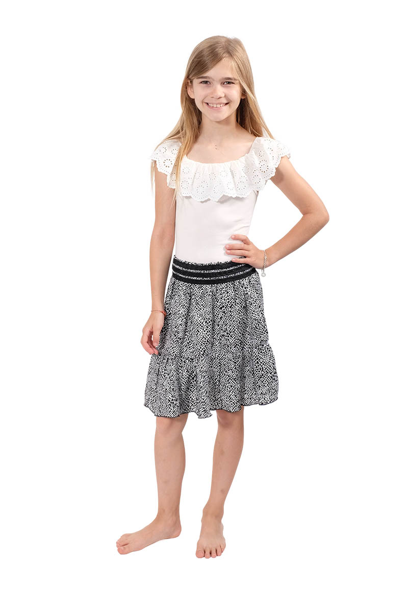 Ein wunderschöner, weiter Stufenrock mit Gummizug und Futter für durchsichtige Chiffon Stoffe. Du kannst ihn aber auch aus Viskose Stoffen nähen, dann entfällt das Futter. Der Rock ist weit geschnitten. Dieses Gummiband haben wir als Zierband genommen. Für Kinder haben wir den Rock auch im Programm, daher haben wir hier noch Bilder mit in die Bebilderung reingenommen.
