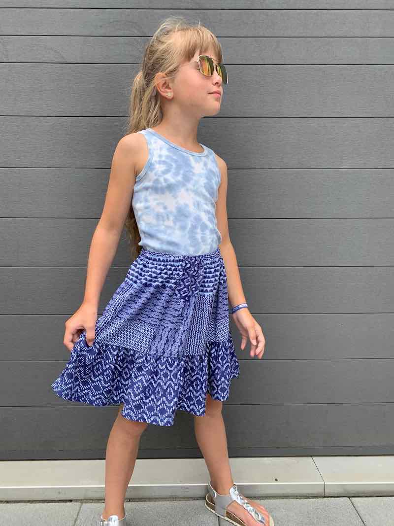 Ein wunderschöner, weiter Stufenrock mit Gummizug und Futter für durchsichtige Chiffon Stoffe. Du kannst ihn aber auch aus Viskose Stoffen nähen, dann entfällt das Futter. Der Rock ist weit geschnitten. Dieses Gummiband haben wir als Zierband genommen. Für Kinder haben wir den Rock auch im Programm, daher haben wir hier noch Bilder mit in die Bebilderung reingenommen.