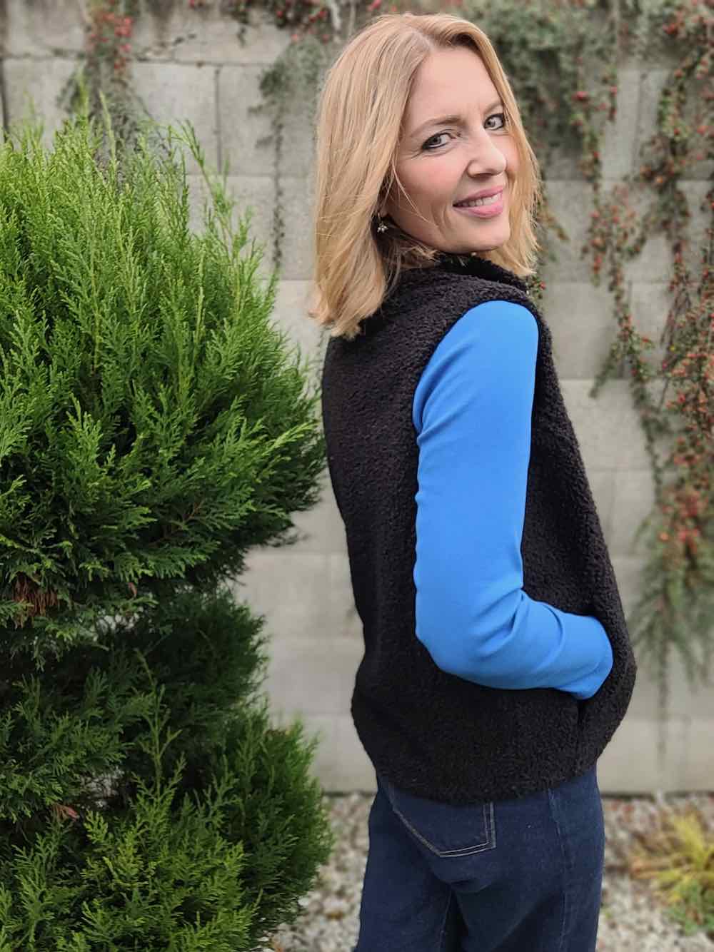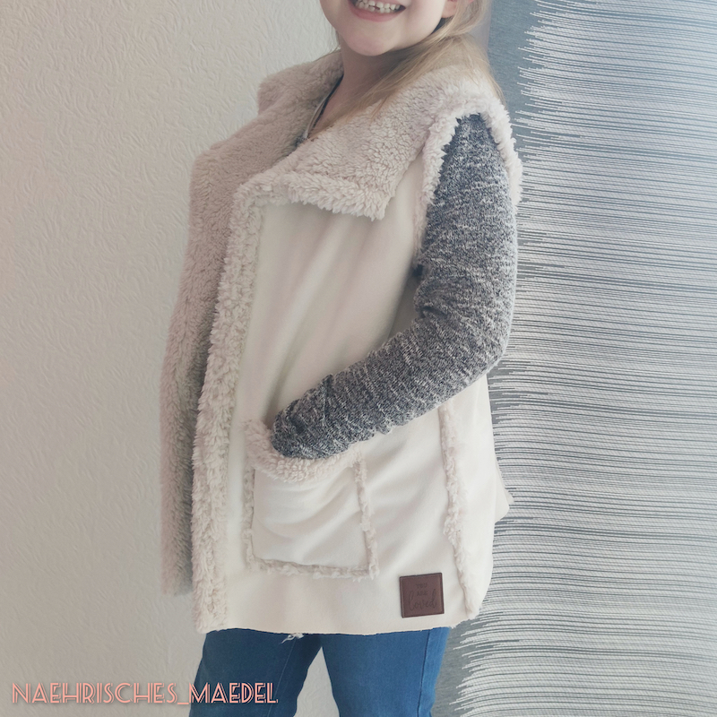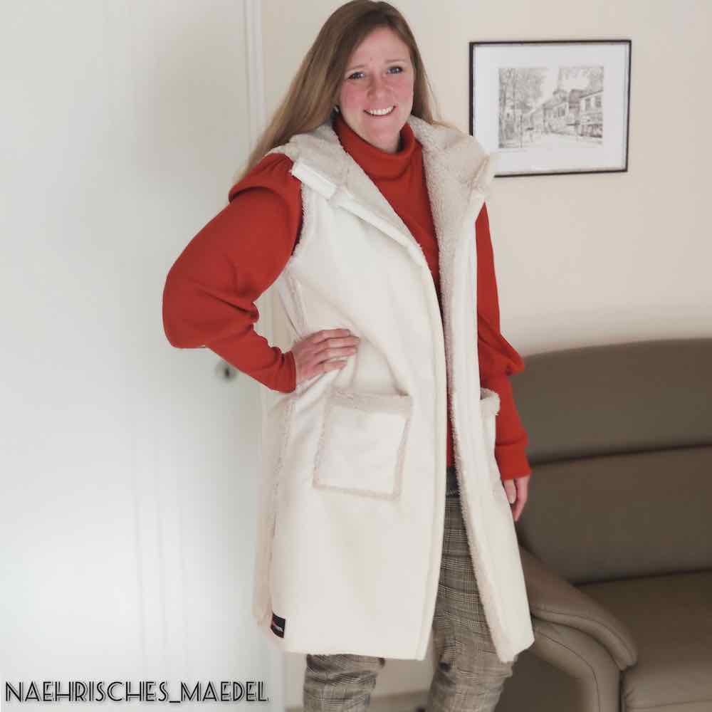 Ein toller double Face Stoff, die Oberseite weist eine Teddyoptik auf, die Rückseite ein Kunstleder in Vintage Optik. Abbildung Weste Thurid und Yonca in ähnlicher Qualität zur Inspiration.