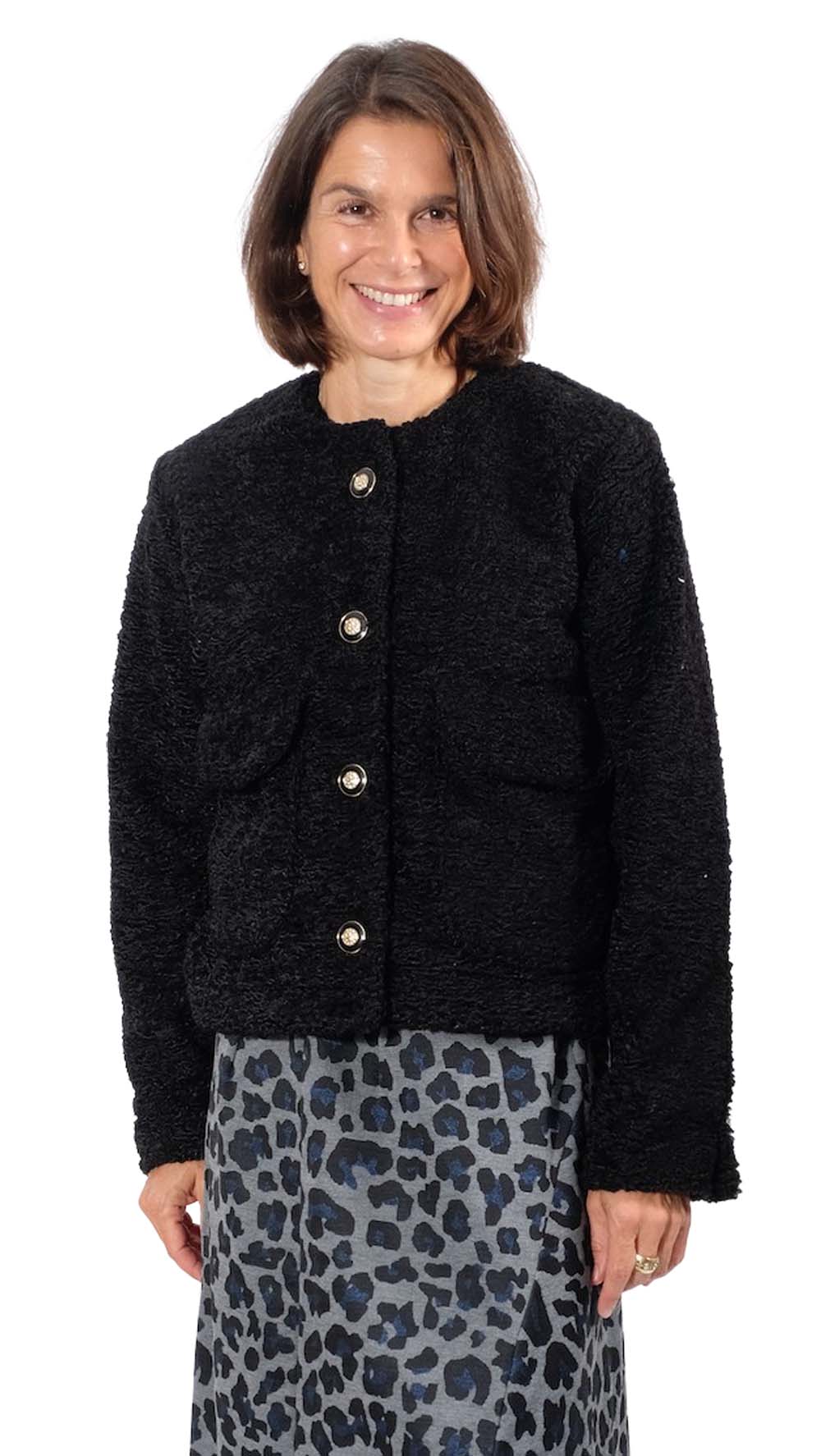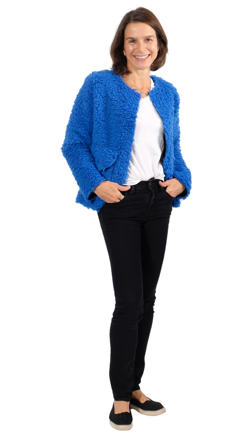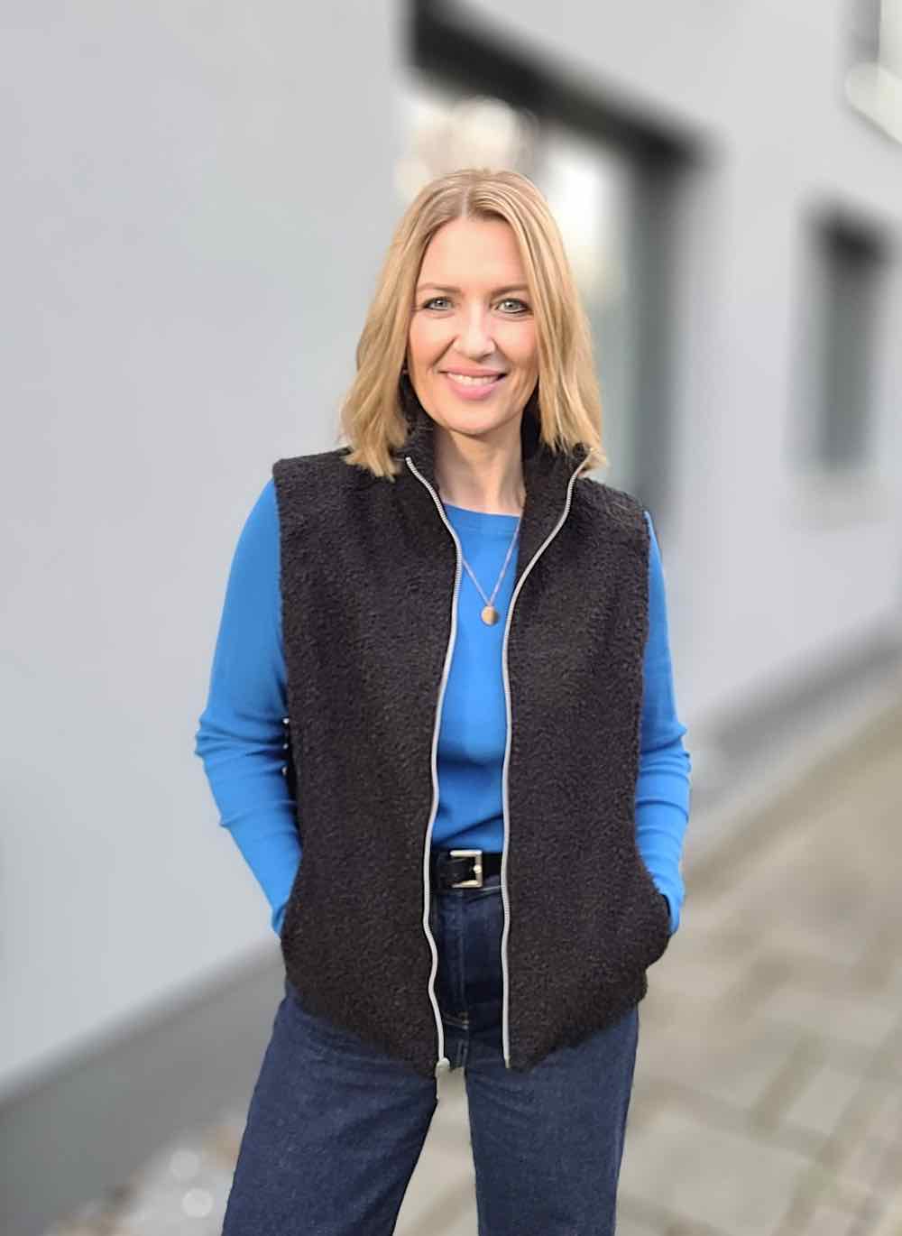 Ein toller double Face Stoff, die Oberseite weist eine Teddyoptik auf, die Rückseite ein Kunstleder in Vintage Optik. Abbildung Weste Thurid und Yonca in ähnlicher Qualität zur Inspiration.