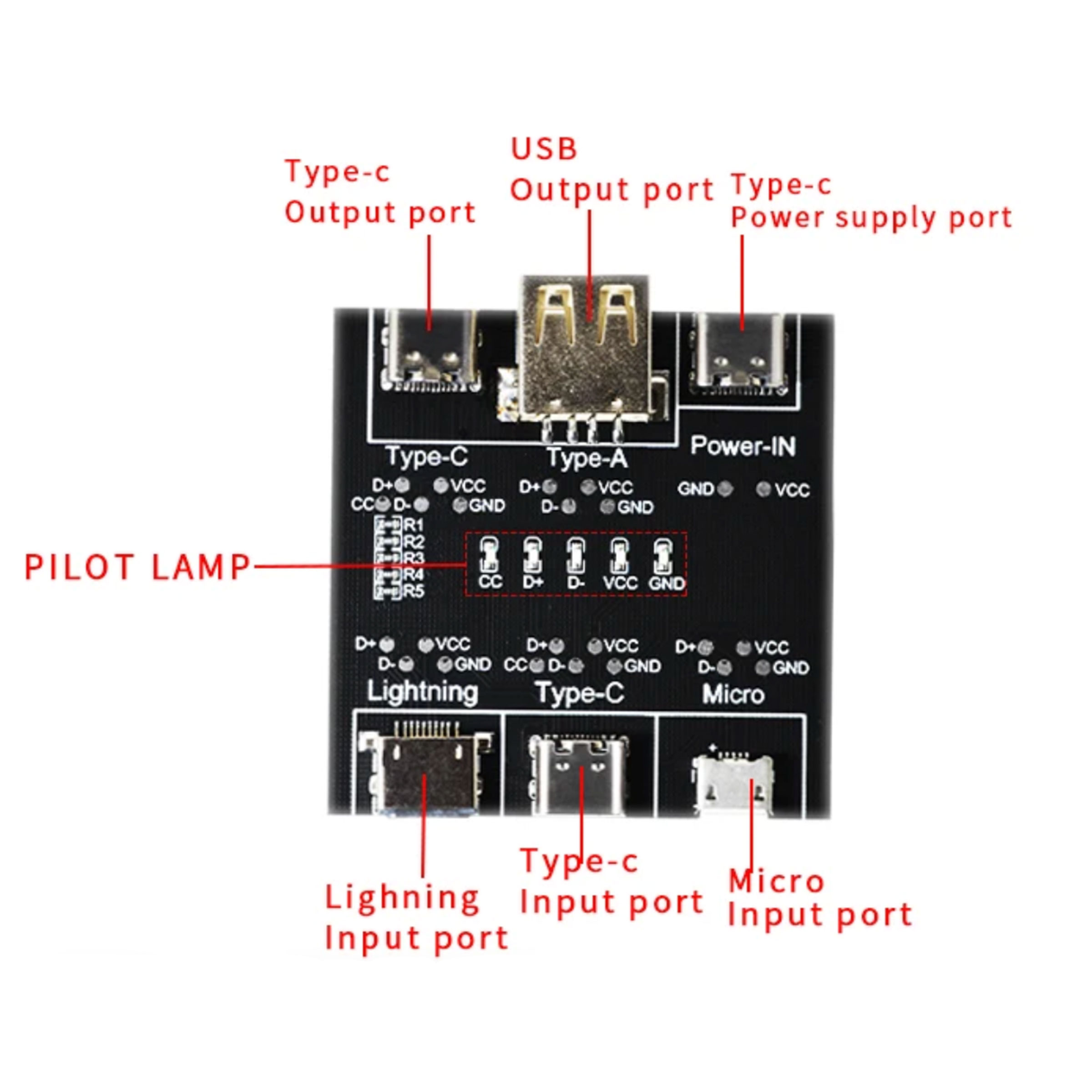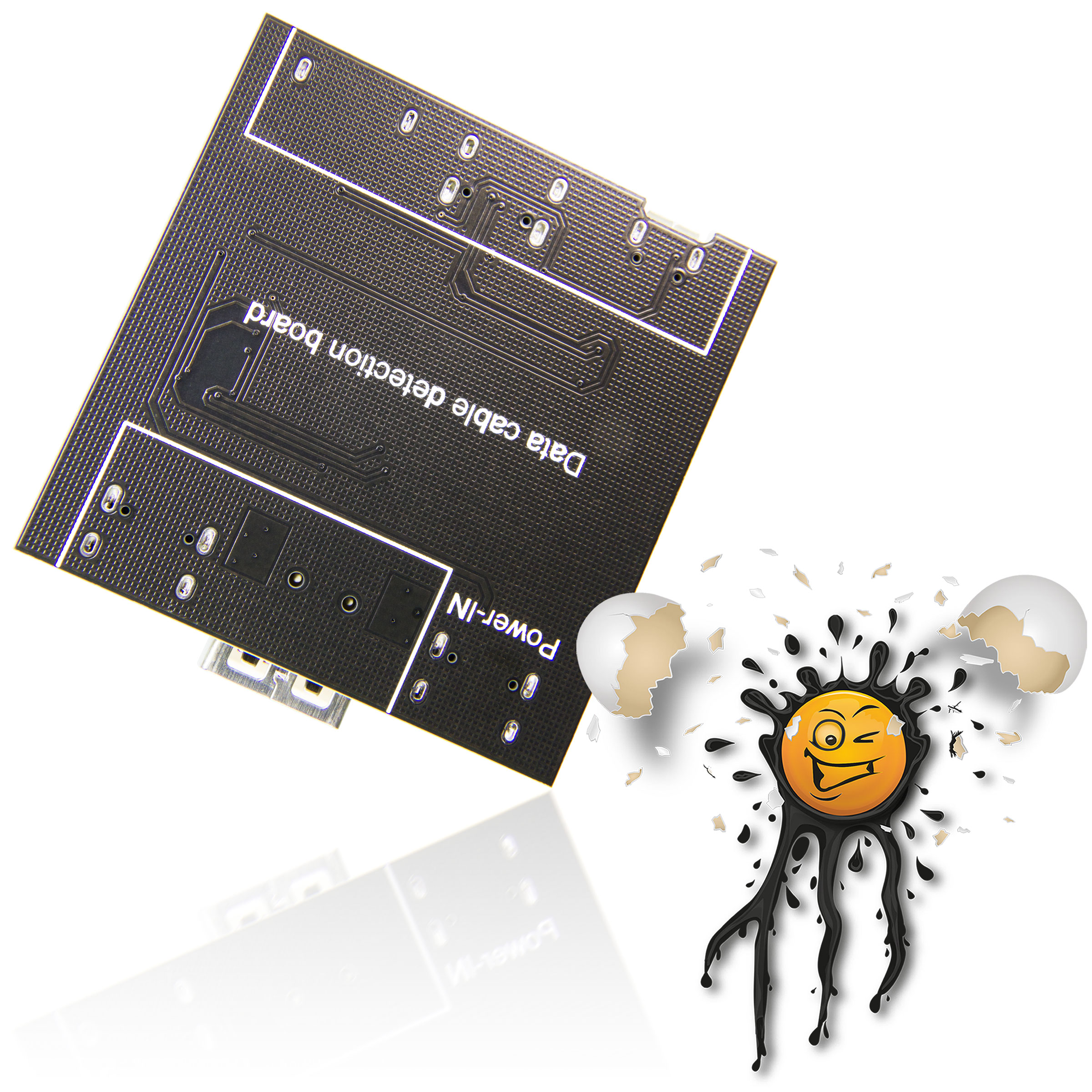 USB Multiadapter Kabeltester Die Kabeltestefunktion erlaubt das einfache Testen von typischen USB Kabel beispielsweise zur Differnzierung zwischen Lade- und Datenkabel, sowie Double Head USB-C Datenkabel. Zum Kabeltest muß stets die USB-C Buchse mit 5V Spannung versorgt werden. Das Modul wird dabei im Weiteren mittels zwischen Signalquelle und Empfänger z.B. Mobiltelefon eingschleift. Die LED’s