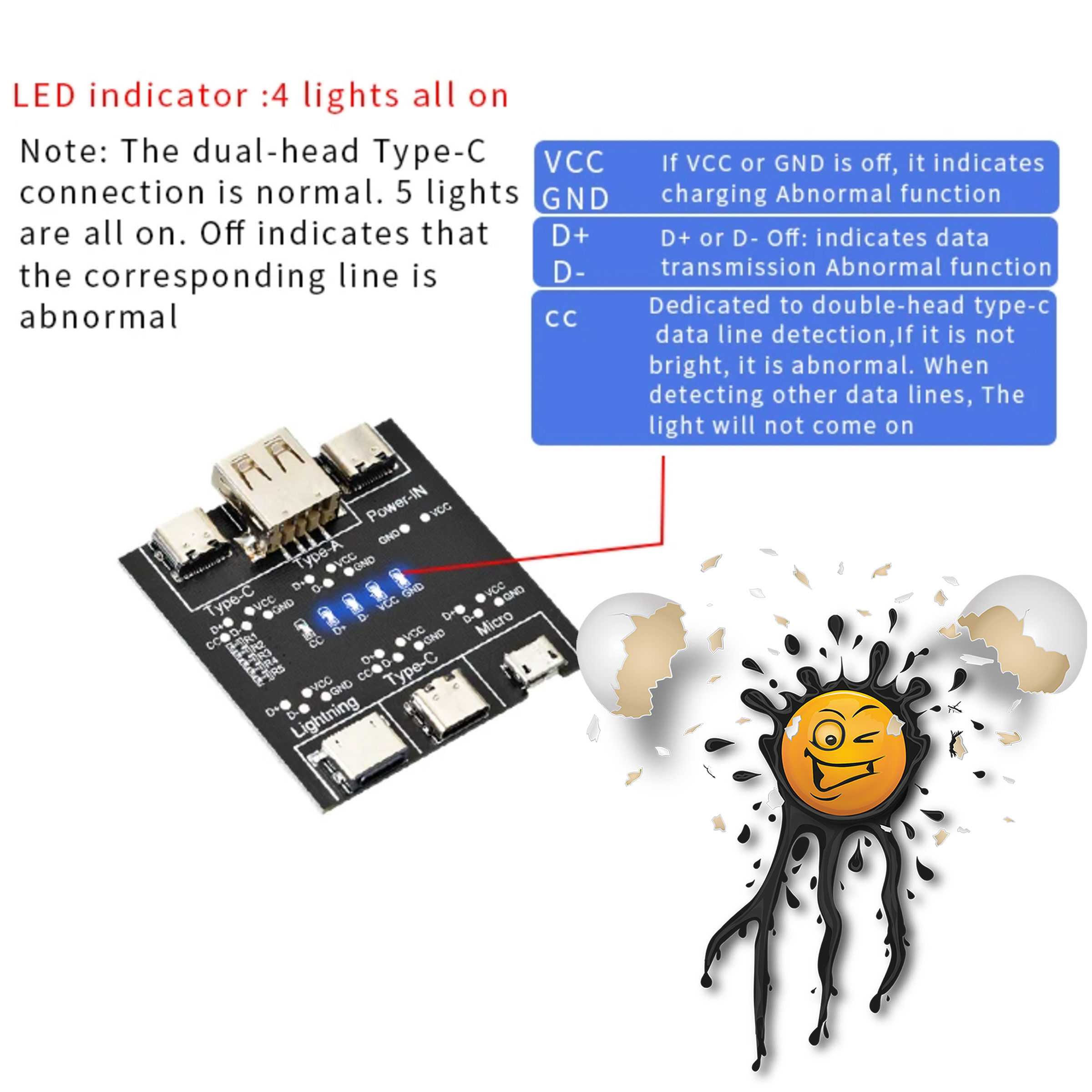 USB Multiadapter Cable tester The cable test function allows you to easily test typical USB cables, for example to differentiate between charging and data cables, as well as double head USB-C data cables. To test the cable, the USB-C socket must always be supplied with 5V voltage. The module is then looped in between the signal source and receiver, for example a mobile phone. The LEDs