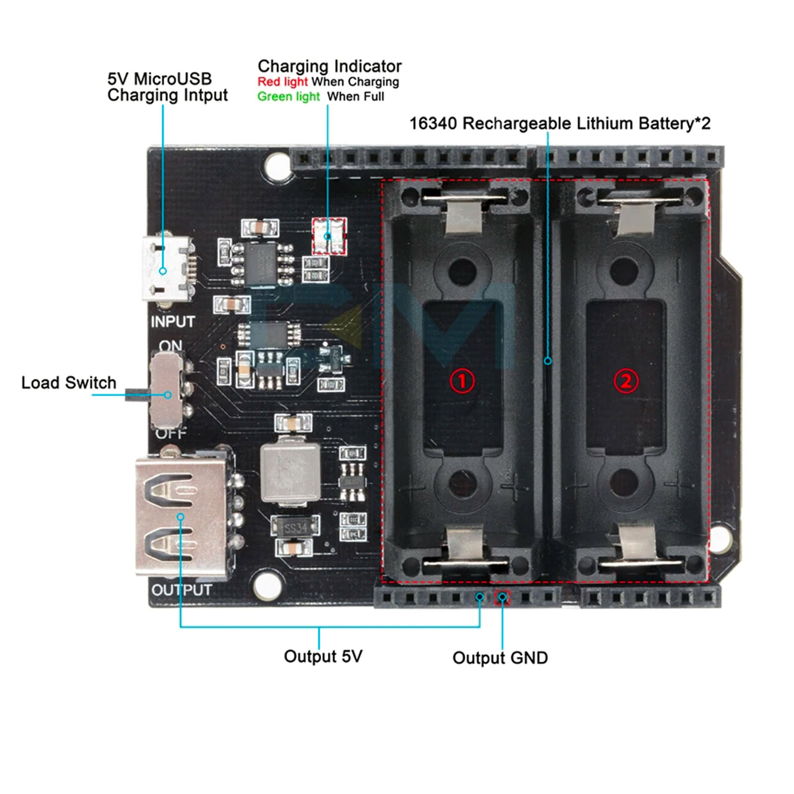 The Arduino Dual 16340 Charger Board supports 2 pcs. 16340 Lithium Batteries. For power supply simply connect the Arduino Dual 16340 Board to USB Micro connector. The power output is supported via the 5V/GND pinsocket (see picture) and thru USB-A socket connector for external devices. The Arduino Dual 16340 Charger Board has