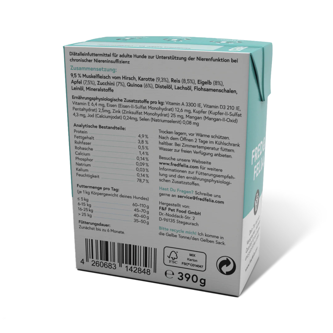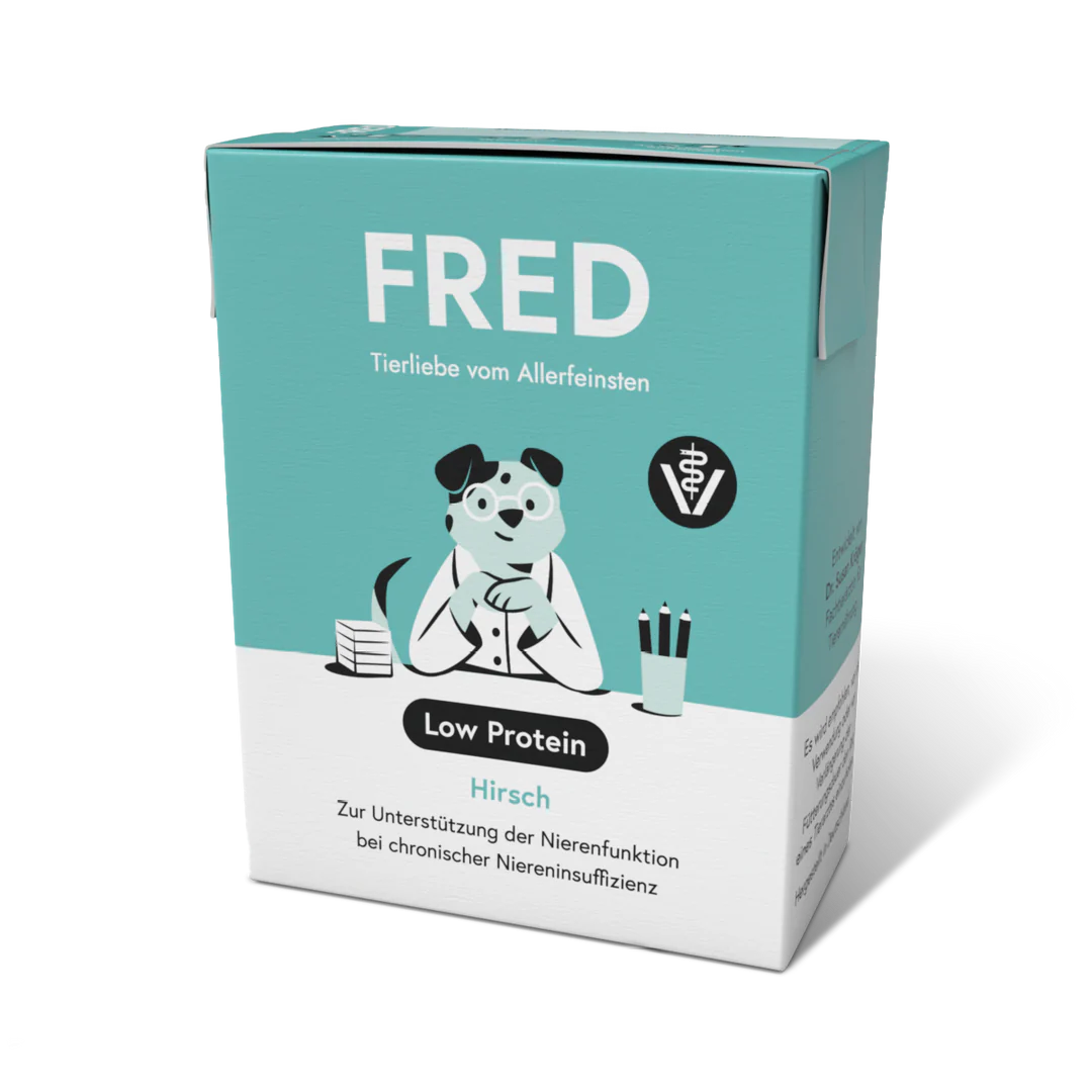FRED VET Low Protein Diätalleinfuttermittel zur Unterstützung der Nierenfunktion bei chronischer Niereninsuffizienz (Muskelfleisch vom Hirsch, Eigelb, Flohsamenschalen)