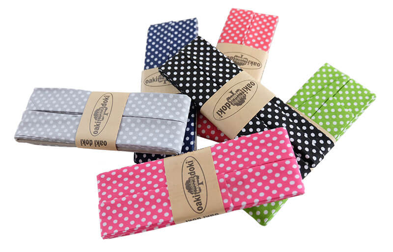 Gepunktetes Schrägband in Baumwolle, vorgefalzt, 20 mm breit – 1 Verpackungseinheit a 3 Meter Länge. Ideal zum Versäubern und Einfassen der Stoffkanten.