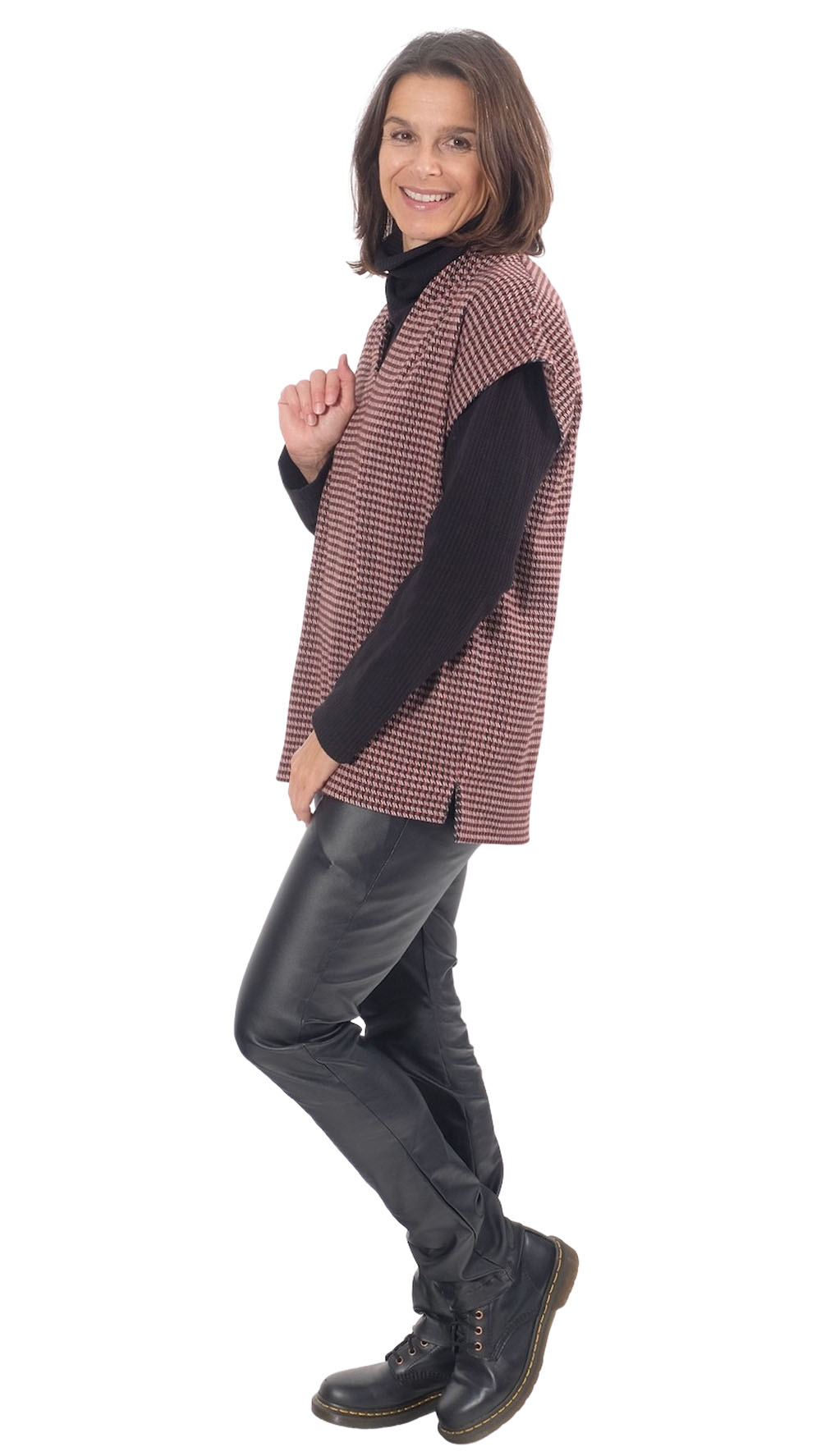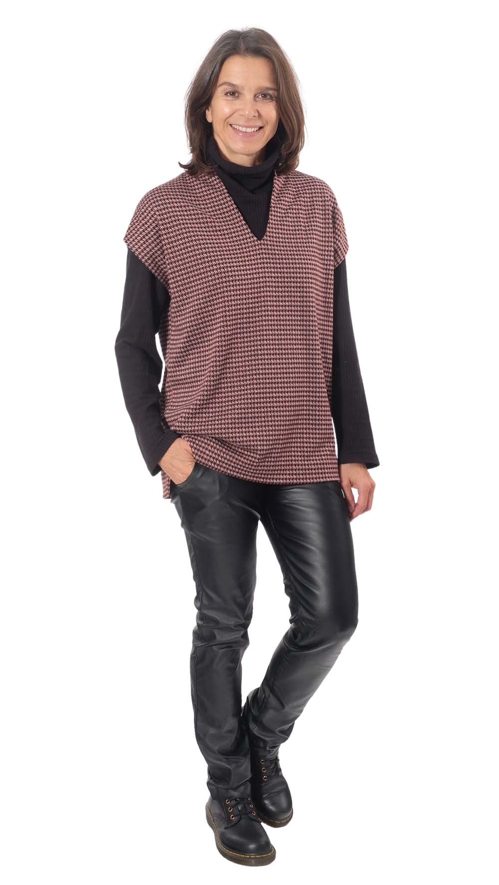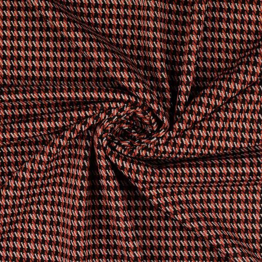 Ein sehr hochwertiger Jacquard Knit einer Musterung im Hahnentritt Style Schwarz / Rost. Das Material eignet sich für Westen, Kleider, Röcke, Hosen und vieles mehr. Abbildung Schnittmuster Shirt Ditte und Dakota in Original Qualität in anderer Farbstellung und Kleid Anika zur Inspiration.