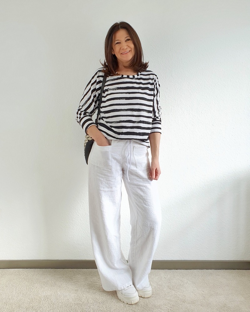 Ein hochwertiger Jersey mit mit zimt-weißen Streifen, die je 1 cm breit sind, bedruckt. Das Material ist ideal für Shirts, Kleider Hosen, Pumphosen und Oberteile. Abbildung Schnittmuster Doro mit blauen breiten Streifen.