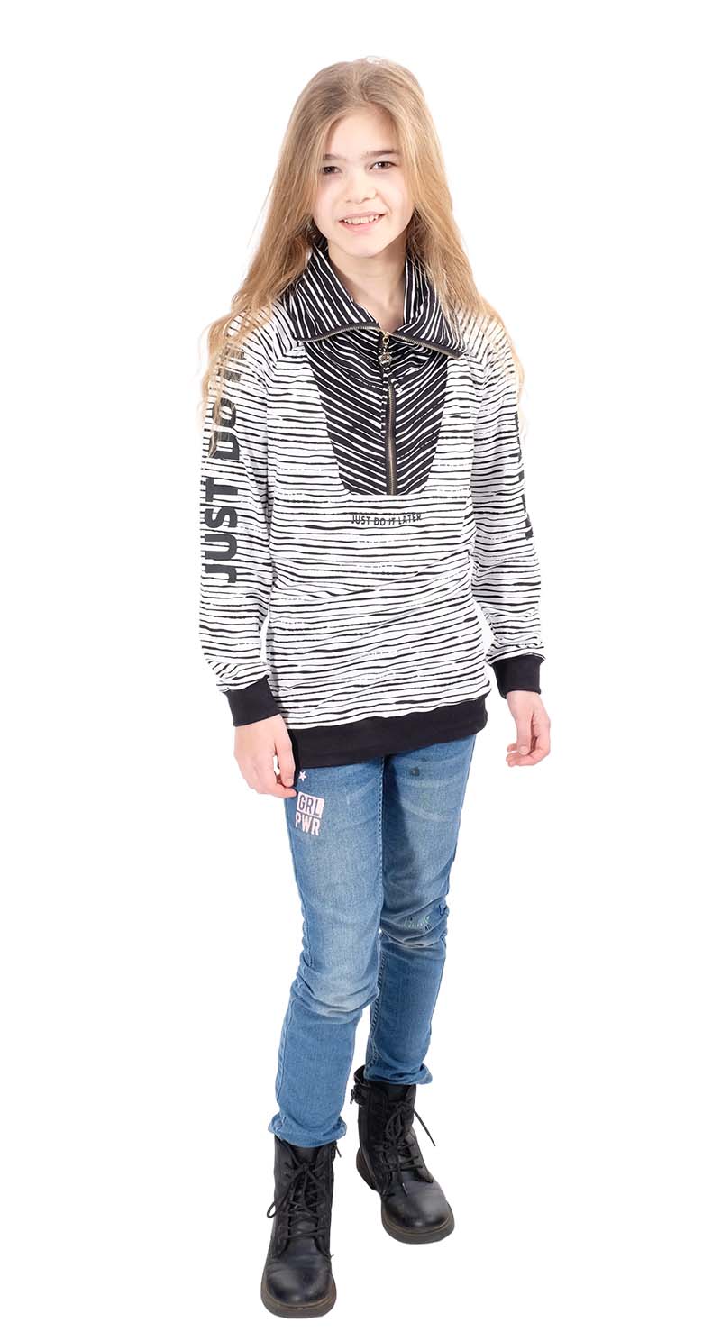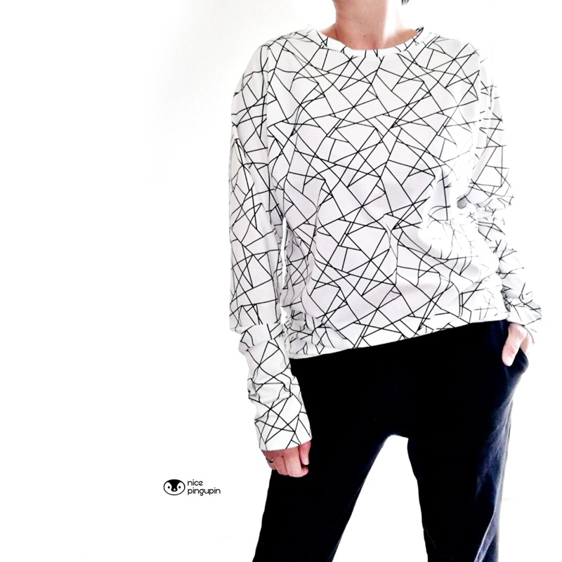 Hochwertiger Jersey aus Baumwolle/Elasthan mit unregelmäßigen Streifen bedruckt. Das Material ist ideal für Kleider, Röcke, Shirts, Mützen, Loopschals, Pumphosen und vieles mehr. Abbildung Kinder Schnittmuster und Troyer Pullover Jasper und Doro in ähnlicher Musterung zur Inspiration.