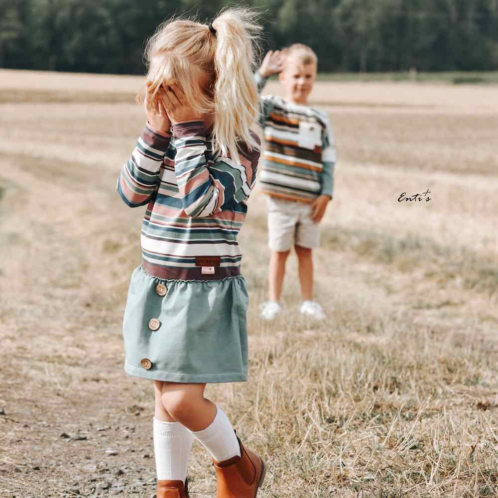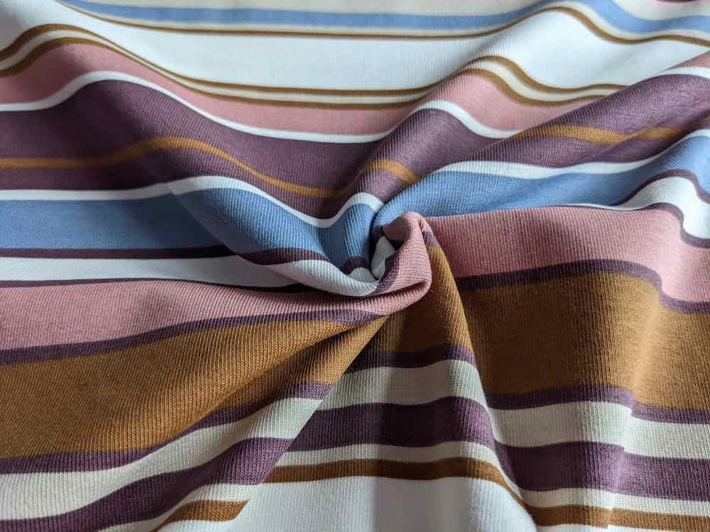 Ein hochwertiger Jersey mit Streifen bedruckt. Das Material ist ideal für Kleider, Shirts, Mützen, Loopschals, Pumphosen und vieles mehr. Abbildung Schnittmuster Konrad und Winnie und Faltenrock Mädchen und Kleid Jule in allen Farbstellungen.