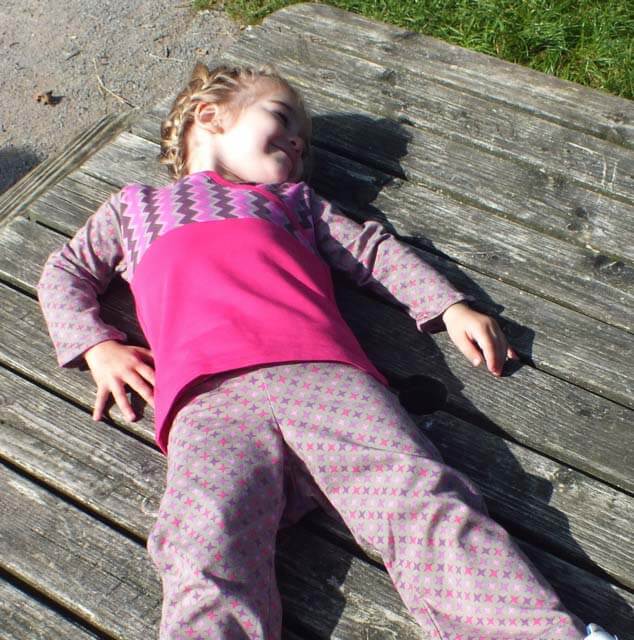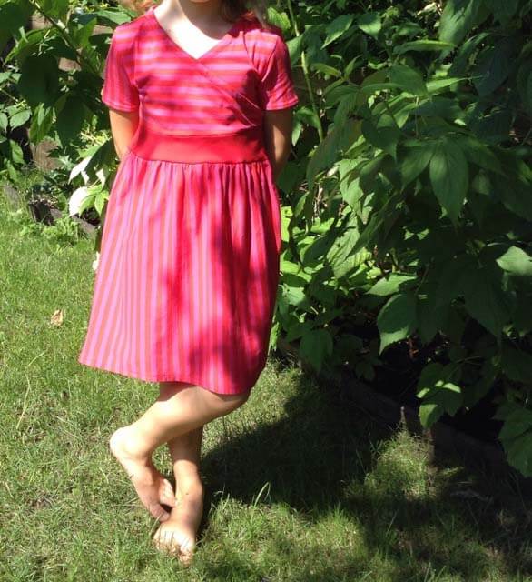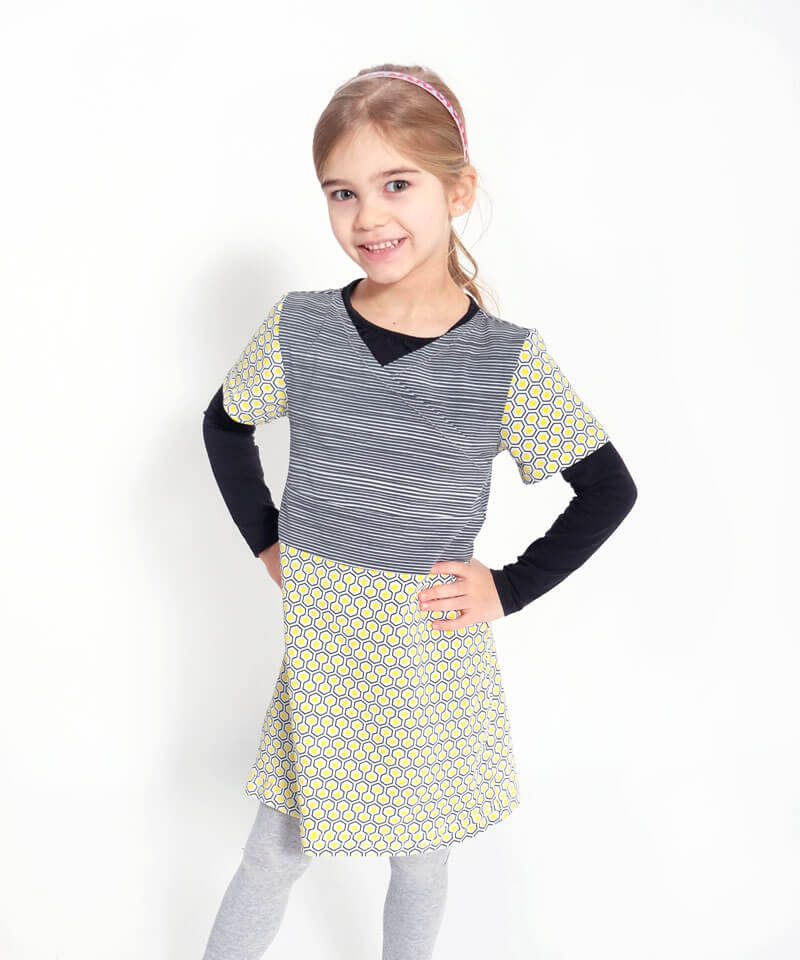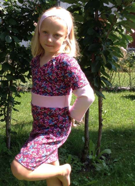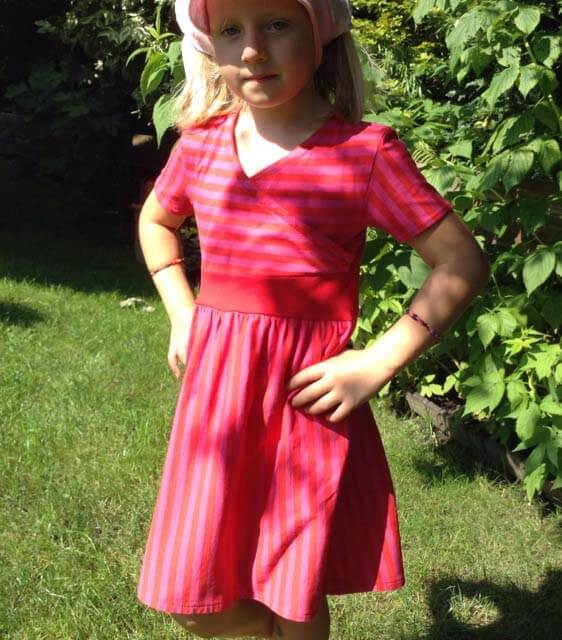 Dieses Kleid ist super schnell genäht wenn Du ein fertiges Schrägband nimmst. Hier kannst Du auch sehr gut Deine Reste aus einer Serie verwerten. Ein sehr hübsches Kleid, nicht nur für den Sommer. Kombiniere es doch in der kälteren Jahreszeit einfach mit einem Body und Strumpfhose darunter? Oder nähe es mit einem langen Ärmel, der ist nämlich im Schnitt mit beinhaltet. Wer kreativ werden will kann einen doppelten Ärmel einnähen bzw. die Rockteile weiter zuschneiden und vor dem Annähen einkräuseln. Oder lasse die Streifen weg, verlängere die unteren Teile und nähe ein Shirt? Lass Dich von unserer Bebilderung etwas inspirieren?