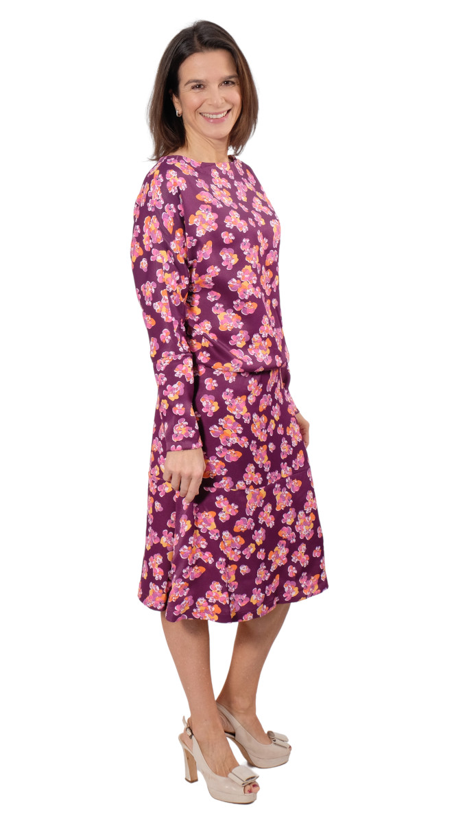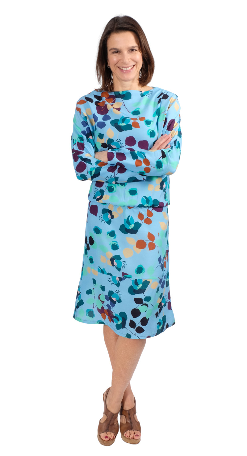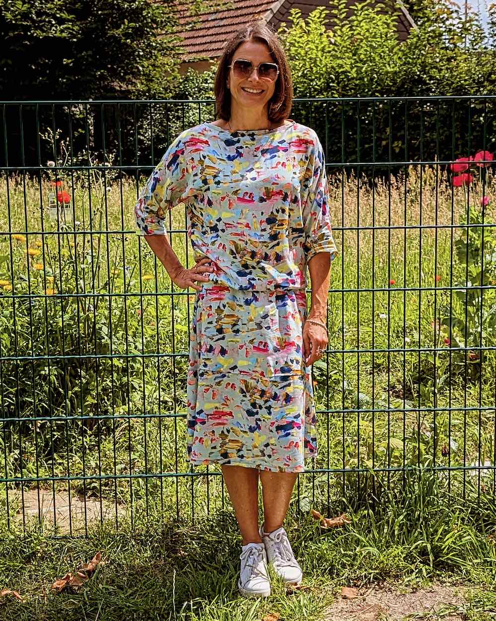 Ein raffiniertes Kleid mit Fledermausärmeln, welches durch die Auswahl des Stoffes immer wieder anders aussehen wird. Das Kleid kannst Du in langer Midi Länge, mit kurzem oder langem Arm nähen. Das Schnittmuster ist sehr vielseitig und jedes Kleid bekommt durch die Stoffauswahl immer einen neuen Look. Es gibt viele Ideen kreativ zu werden. Im Video zeigen wir auch eine kleine Abwandlung wie man sich daraus ein raffiniertes Kleid nähen kann! Aber auch als Pullover ist das Schnittmuster geeignet.