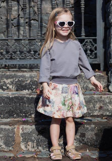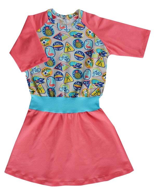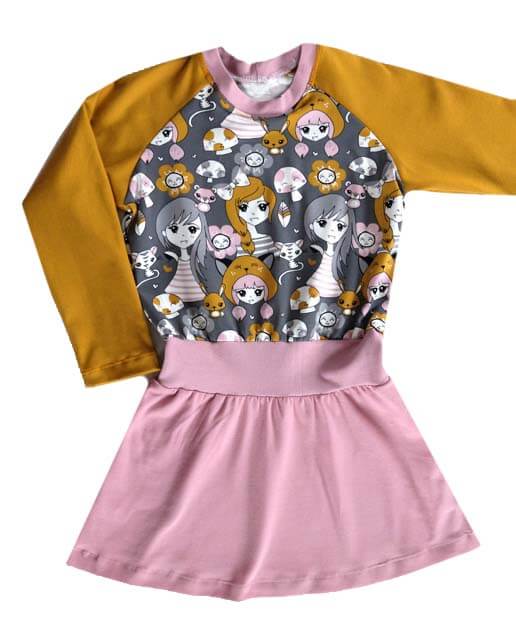 Du möchtest ein simples Kinderkleid mit großer Wirkung nähen? Dann bist Du hier genau richtig. Das Oberteil ist ein Raglanshirt und man kann hier toll mit verschiedenen Stoffen spielen. Das Oberteil sollte immer aus einem dehnbaren Material wie Jersey genäht werden, bei dem Rock kannst Du jeden weich fallenden Stoff nehmen. (z.B. Babycord, Baumwolle oder leichte Denimstoffe) Ob einfarbig oder aus verschiedenen Stoffen, mit kurzen oder langen Armen, die Möglichkeiten sind bei diesem Modell wirklich sehr vielfältig. Ein tolles Projekt für alle Nähanfänger, die noch keinen Jersey vernäht haben.