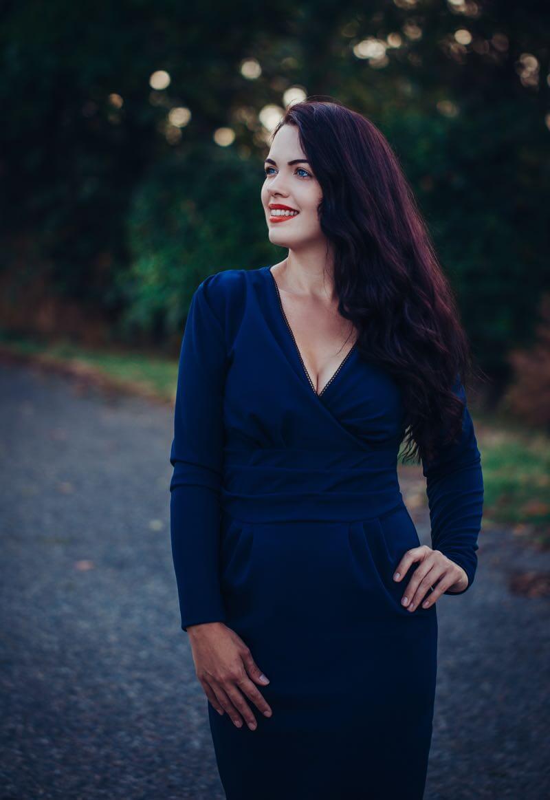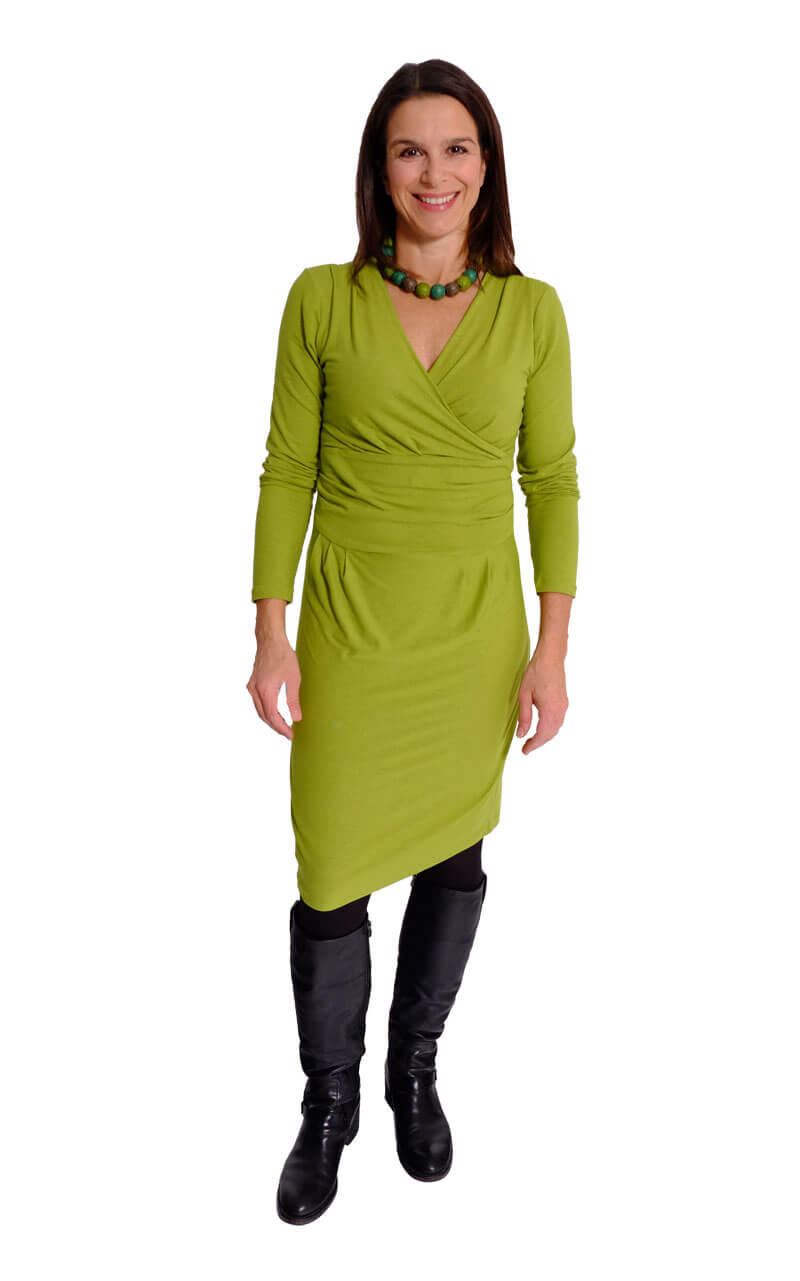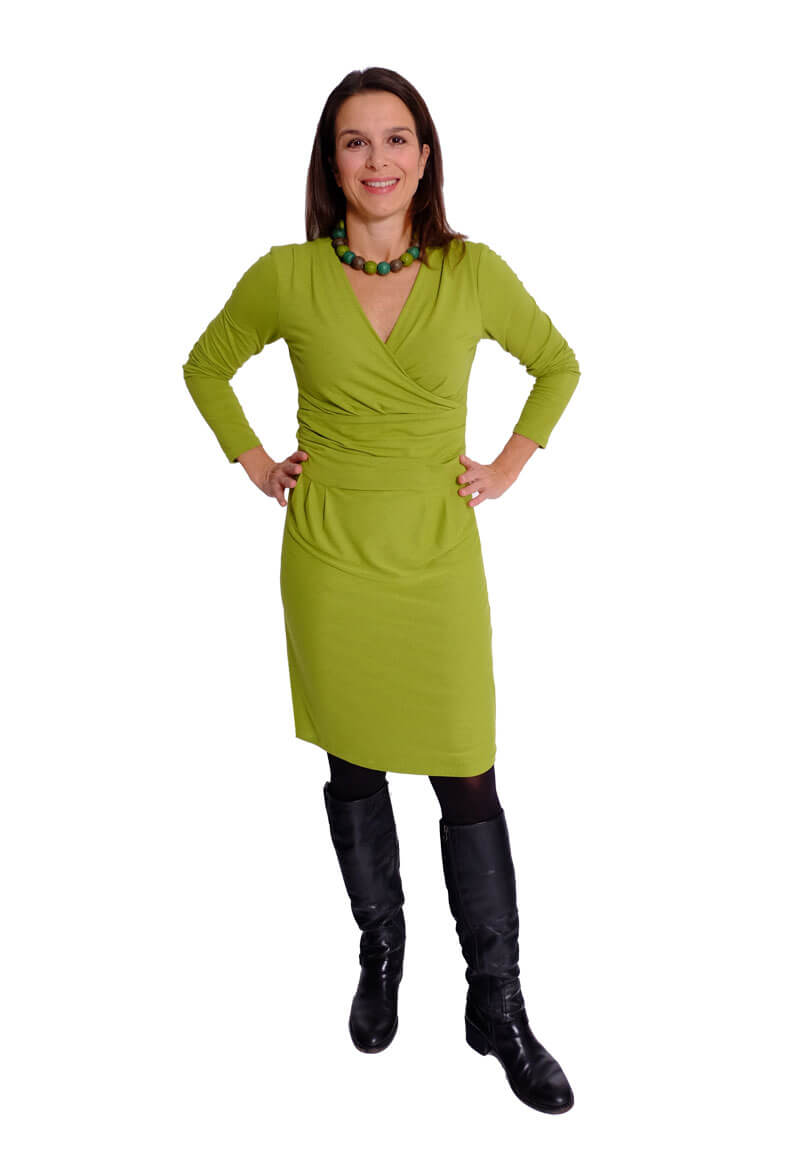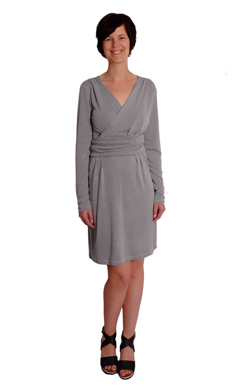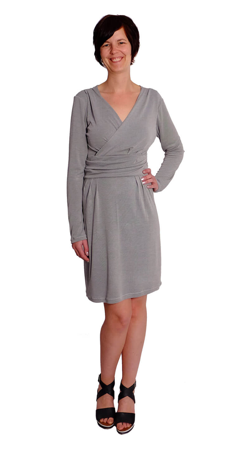 Das Kleid “RONA” ist ein tolles Kleid mit raffinierten Akzenten. Durch den übereinander geschlagenen V-Ausschnitt und die Falten in der Taille sieht es optisch aus wie ein Wickelkleid. Das Kleid ist bis zur Taille figurnah geschnitten, das Rockteil dafür etwas weiter, so dass es um die Hüfte figurumschmeichelnd sitzt. Wir haben für dieses Modell das Oberteil und den Rock mit einem dehnbaren Wirkfutter bzw. Mesh Futter verarbeitet. Dadurch erhält das Kleid eine tolle “Wertigkeit”. Ihr könnt aber auch den Rock komplett ohne Futterstoff nähen, das geht natürlich auch. Für das Oberteil kann optional ein leichter Viskosejersey als Futter verwendet werden. (Wer das Damenkleid komplett ohne Futter nähen möchte der kann beim Oberteil alle Stoffkanten rundherum um 1 nach innen einschlagen und absteppen, das ist auch möglich.) Dieses wunderschöne Kleid kannst Du durch verschiedene Stoffe immer wieder anders aussehen lassen.