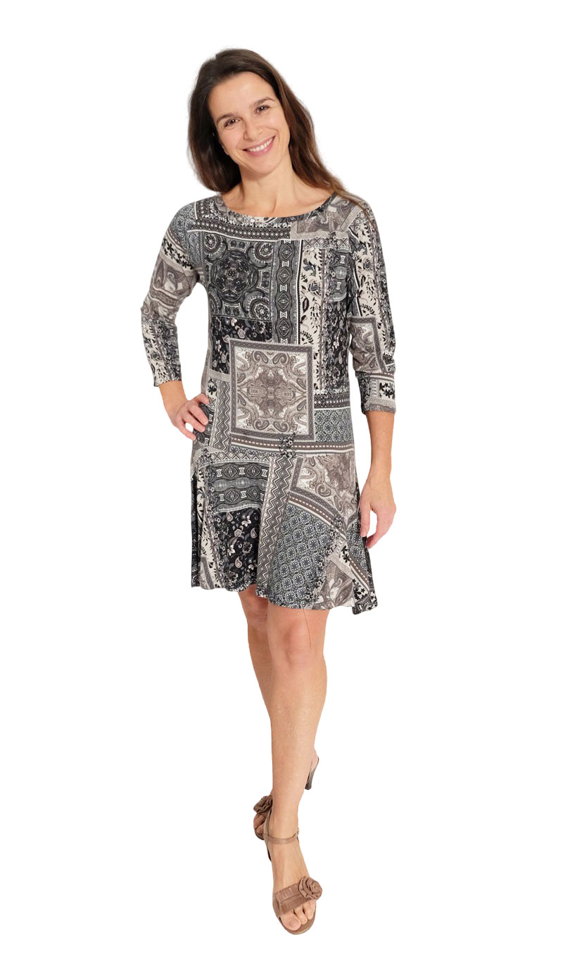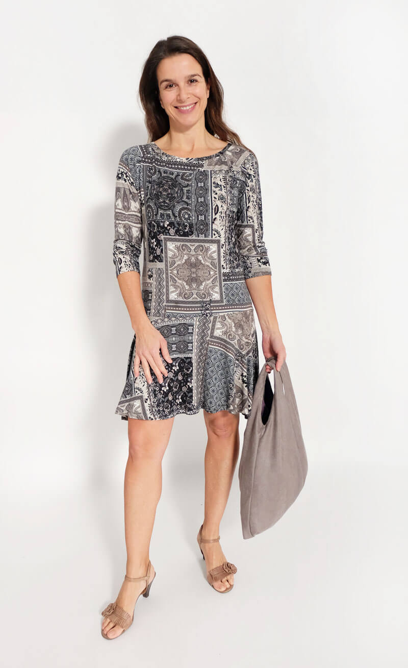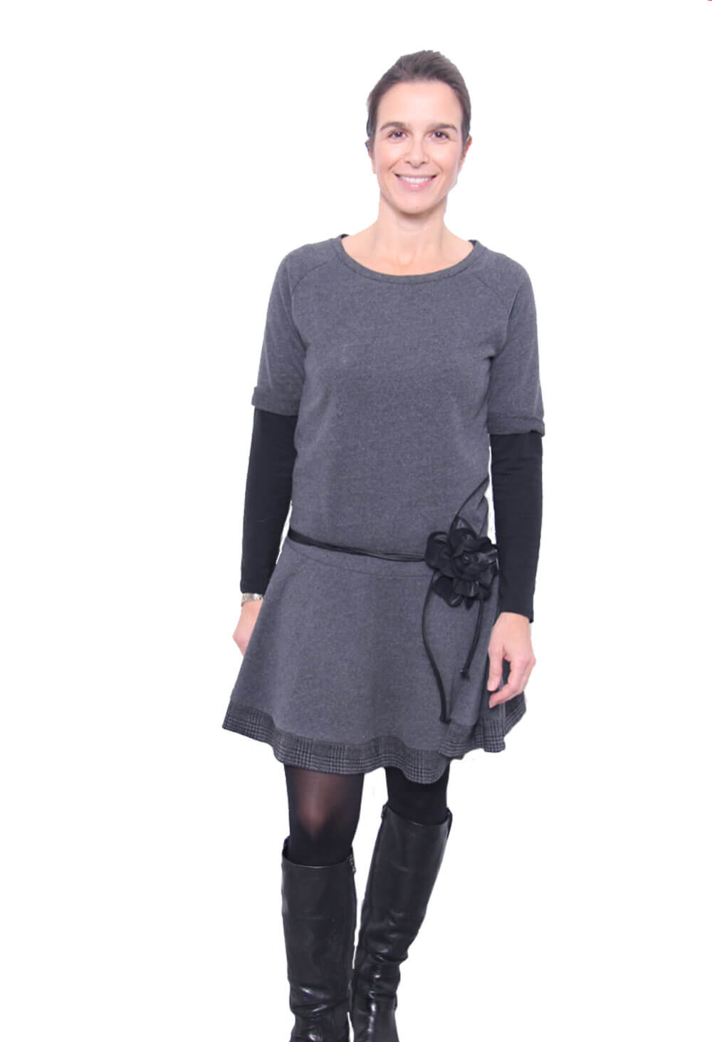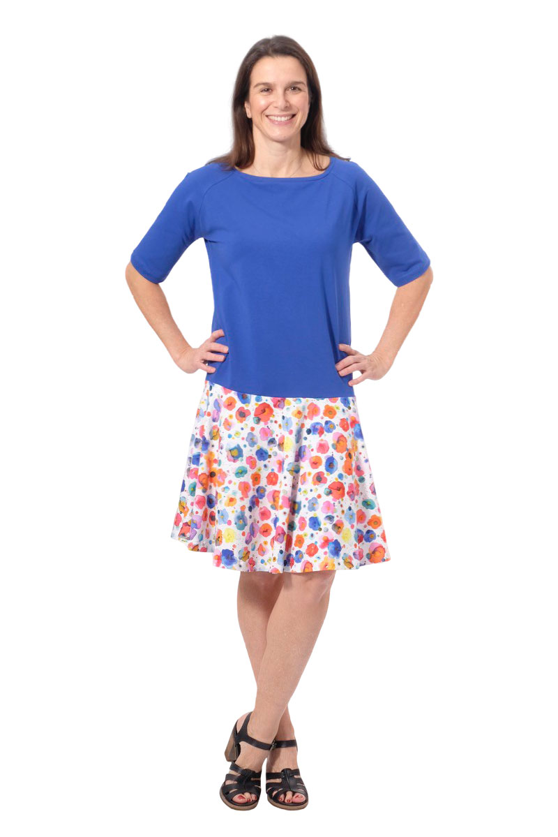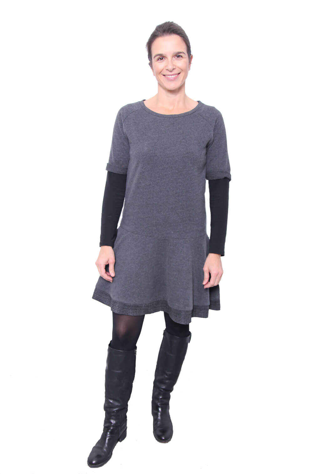 Dieses leger geschnittene Raglankleid eignet sich für viele Figurtypen und ist ganz einfach genäht. Du kannst das Kleid mit langen oder kurzem Arm, mit oder ohne Streifen am Saum nähen. Die Variationsmöglichkeiten sind vielfältig. Wer möchte, kann sich das Oberteil verlängern und sich einen Pullover zaubern…) Der Rock ist ein weit geschnittener Glockenrock. Der Schnitt ist leger weit geschnitten.