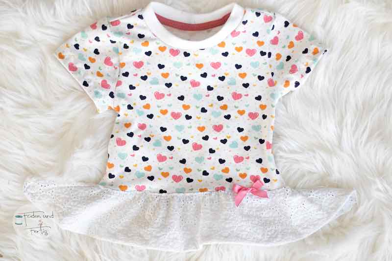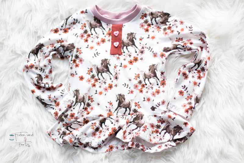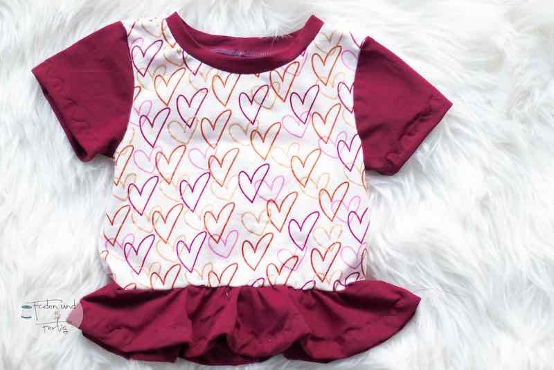 Dieses hübsche Schnittmuster ist vielseitig wandelbar. Ob mit Volant oder ohne, in kurz oder lang, aus einem Stoff oder aus verschiedenen Farben, hier kannst Du Dich kreativ austoben. Auch für die Resteverwertung von Jerseystoffen ist das Outfit ideal. Wer möchte kann sich hier natürlich auch ein Kleid nähen, dafür einfach das Schößchen verlängern…