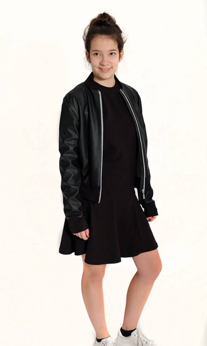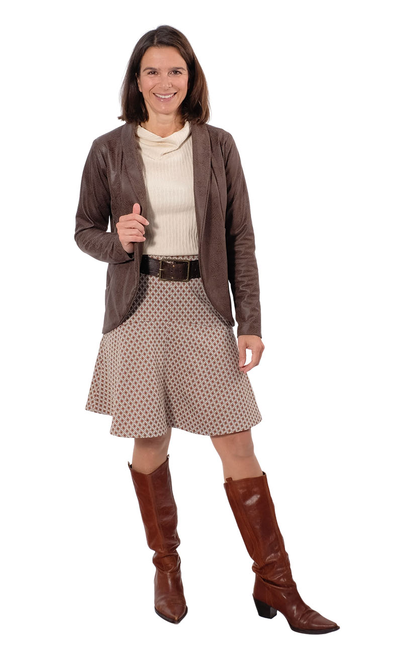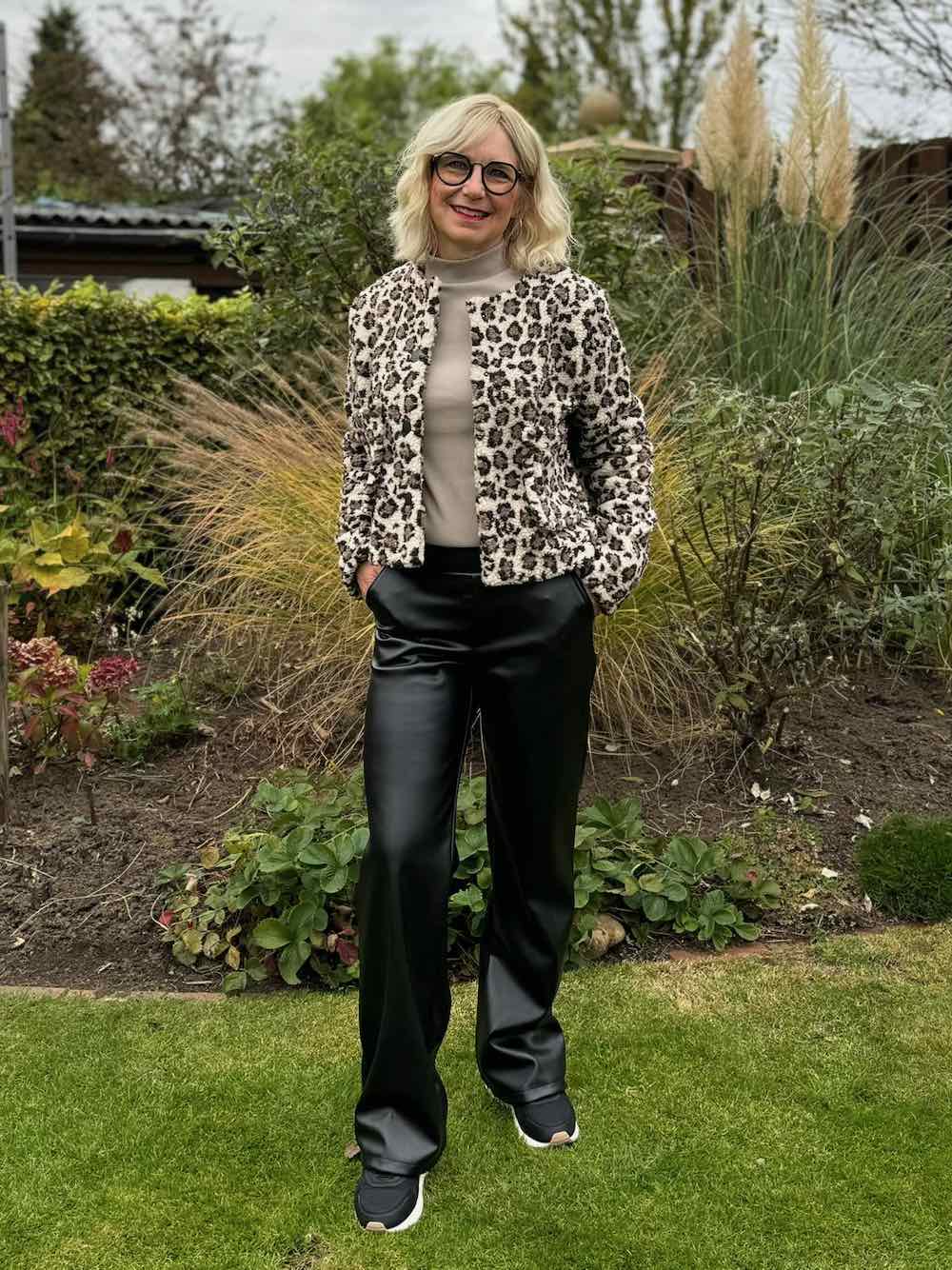 Dieses Kunstleder ist weich und strapazierfähig, somit eignet es sich hervorragend für  Hosen, Kleider, Blazerjacken, Jacken, Accessoires, Röcke und vieles mehr.  Abbildung Schnittmuster Hose Berta, Tasche Pola, Jacke Kiran und Bennie, Rock Laila, und Blazer Lilo zur Inspiration.