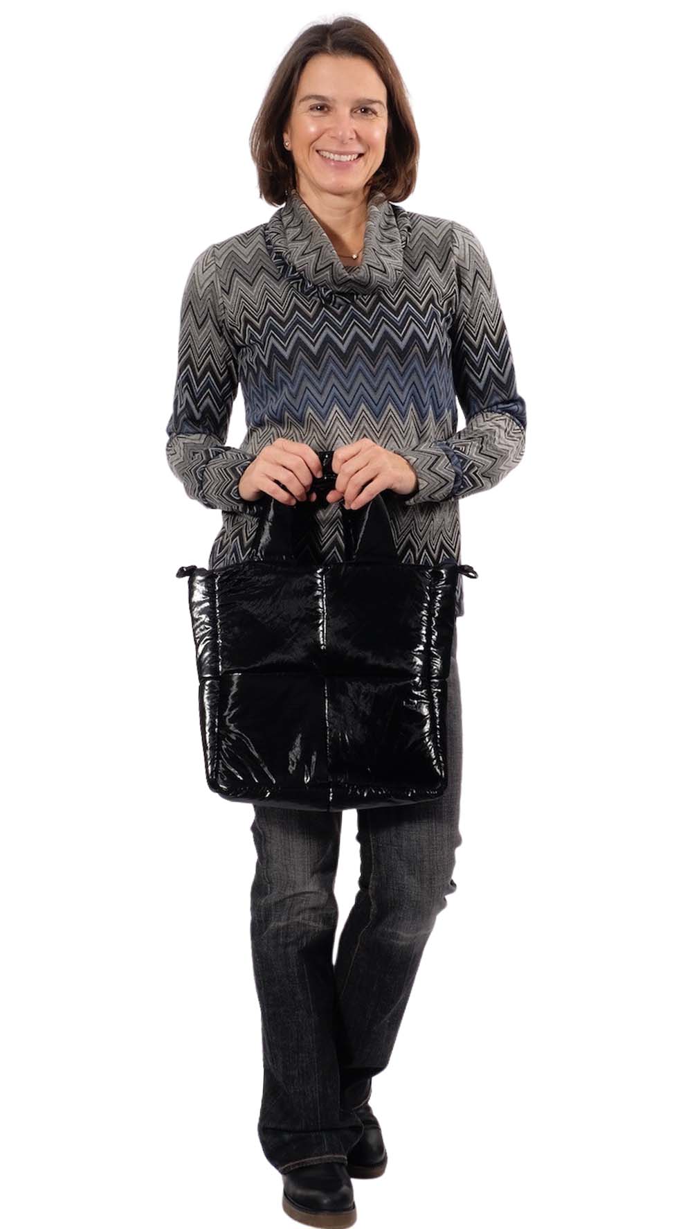 Dieses Kunstleder mit Metallic-Effekt ist weich und strapazierfähig, somit eignet es sich hervorragend für Taschen, Jacken, Windbraker, Accessoires und vieles mehr. Der Griff ist soft und angenehm, es lässt sich hervorragend einfach verarbeiten, auch mit der normalen Nähmaschine. Abbildung Schnittmuster Trapeztasche Yalene und Puffertasche Saphira, Jacke Bente und Kiran, Beuteltasche Pola in Blau und Taupe und Collegejacke Bennie in Silber. Dieses Leder eignet sich auch hervorragend für unsere Tasche Valeska.