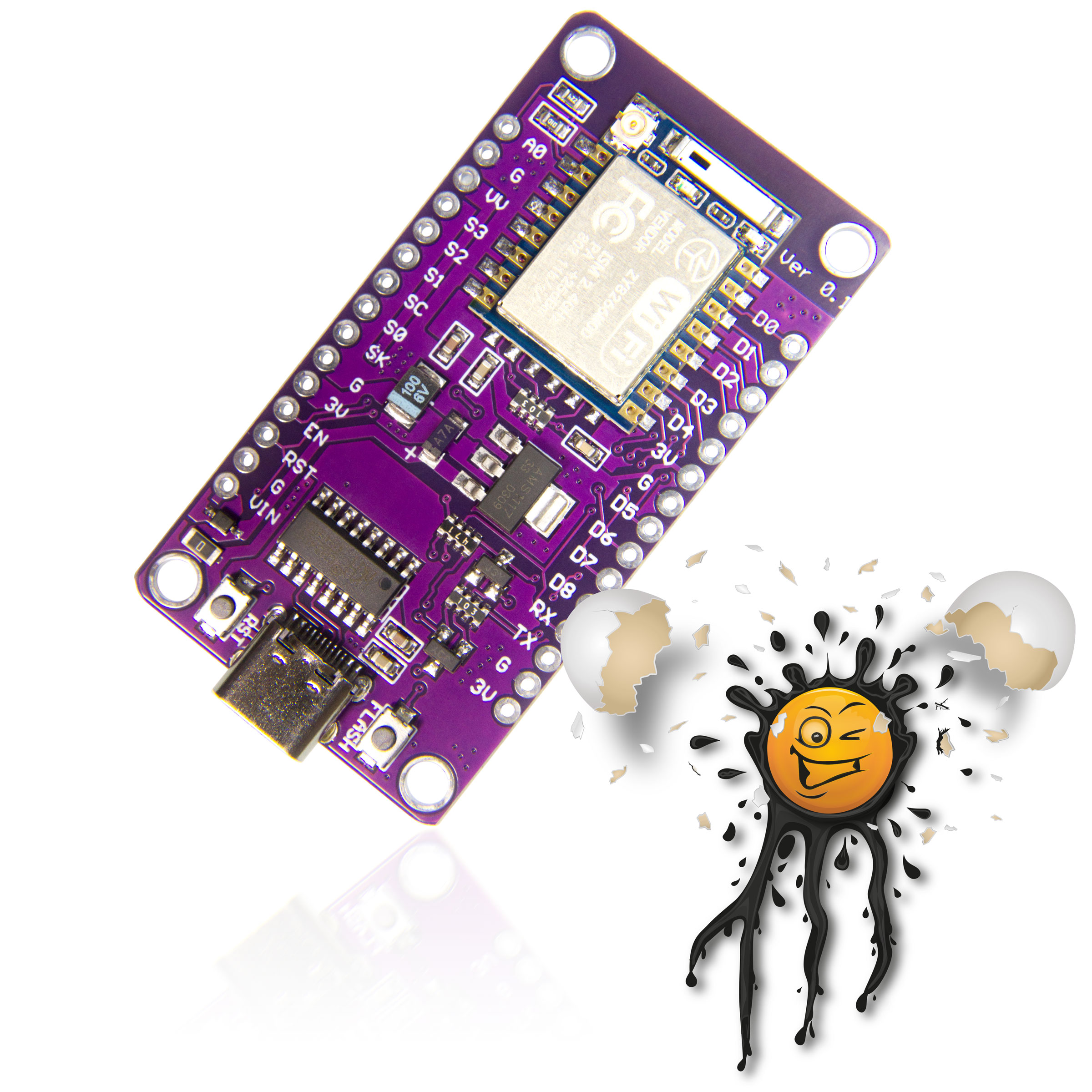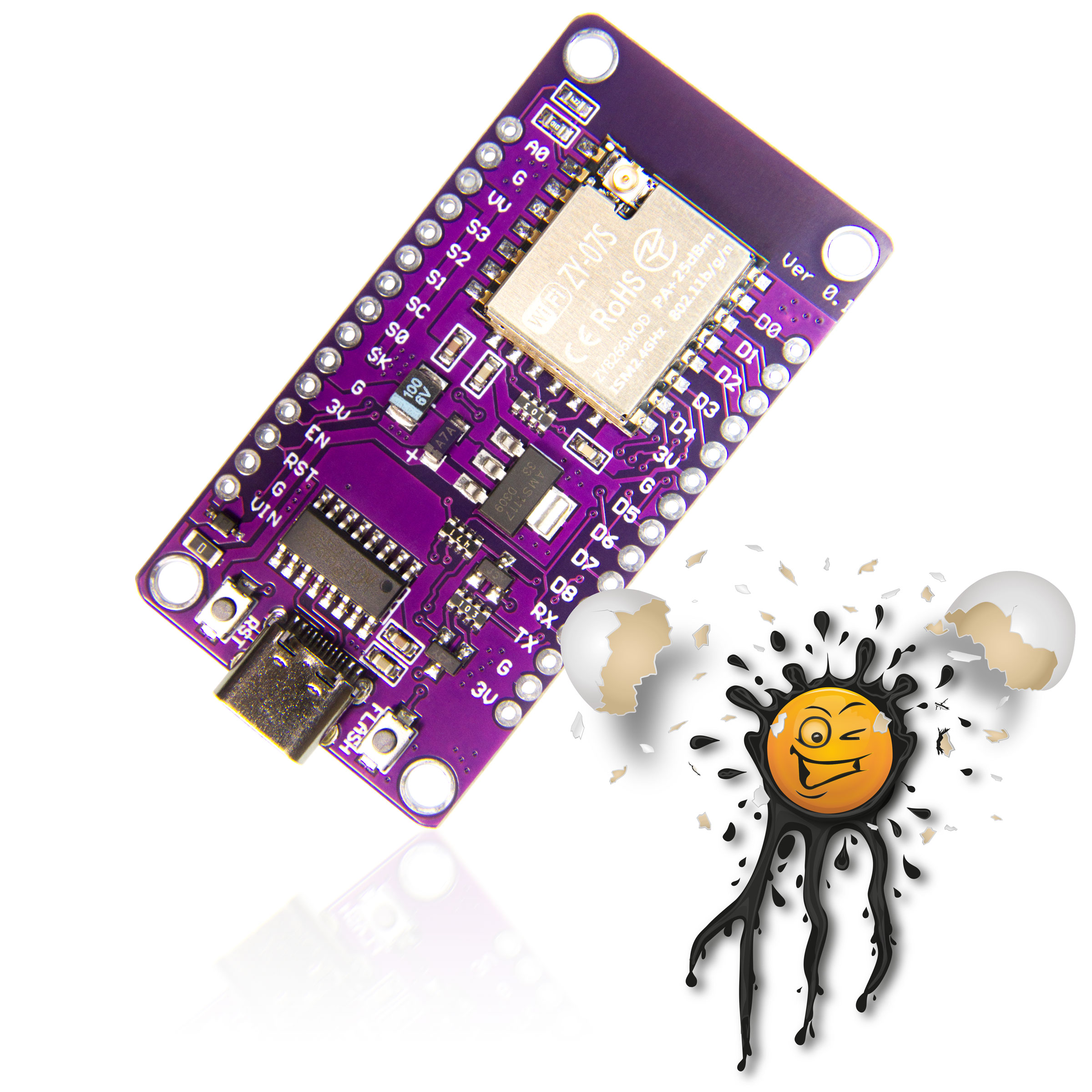 Compared to typical ESP8266 Module there is no need connecting GPIO thru resistors to GND for Flashing nor Reset, simply press integrated FLASH or RST Button.