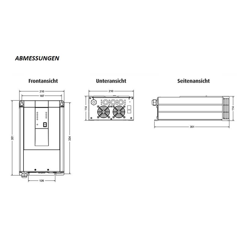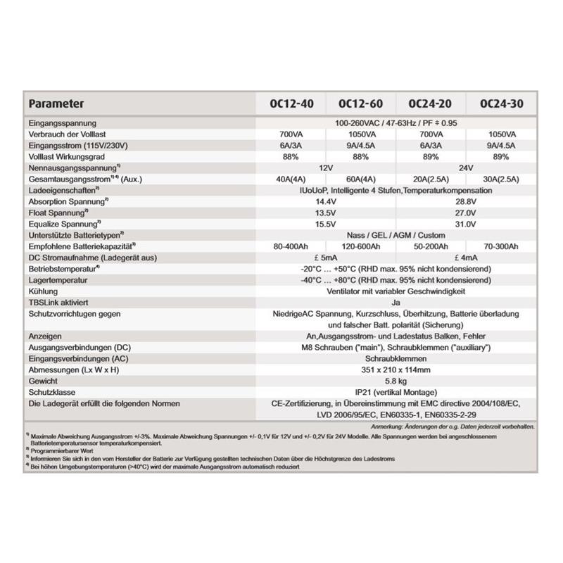 Zwei Akkuausgänge. Solides Design. Für einen kontinuierlichen Ladevorgang ausgelegt. Hocheffizient. Universeller Wechselstromeingang mit automatischer Bereichsanpassung. Blindleistungskompensierung. Gegen Akkustörungen, Übertemperaturen, Überlast, Kurzschluss und niedrige Eingangsspannung geschützt. Mehrphasige intelligente Ladealgorithmen. Bis zu 8 Phasen an Ladealgorithmen programmierbar. Per Fernsteuerung ein – und ausschaltbar. Alarm – Relais. Lüfter mit variabler Geschwindigkeit für einen geräuscharmen Betrieb. Fernsteuerungsfähig über den TBS Link. Leichter Zugang zum Anschlussbereich für die Installation der Wechselstrom -, Gleichstrom- und Steuerungsverkabelung. Temperatursensor inbegriffen. CE zertifiziert.