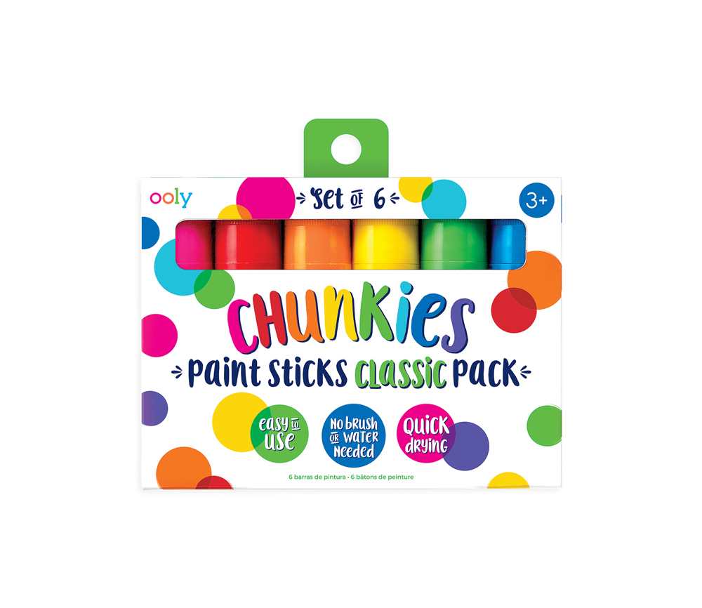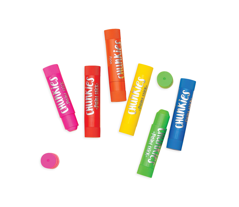 6 leuchtende Farbstifte Neon Chunkies von OOLY. Die Stifte sind einfach im Gebrauch, einfach Kappe entfernen und aufdrehen, von der Handhabung und Effekt her wie ein Wachsmaler mit coolen Neonfarben. Ein toller, innovativer Malspaß für kleine Künstler, die gern mit Farben experimentieren.