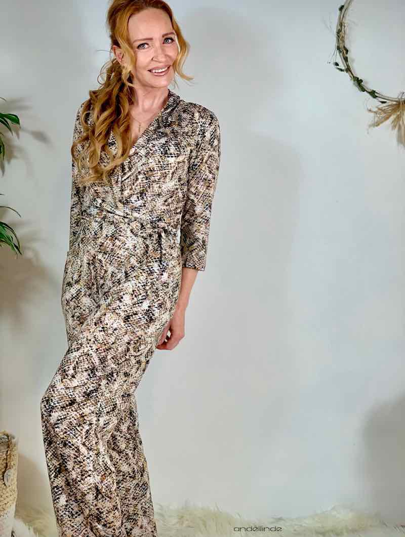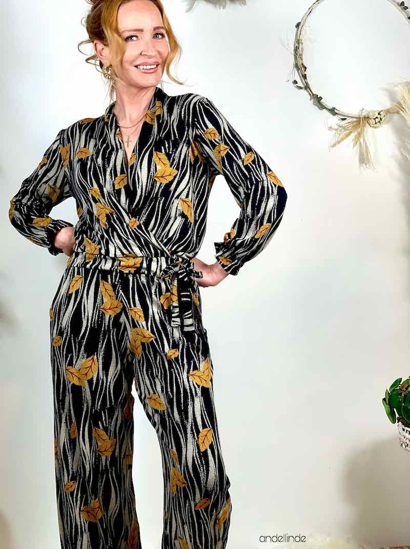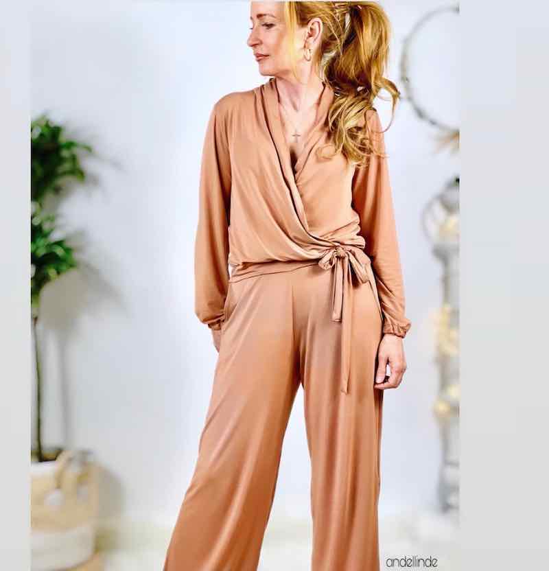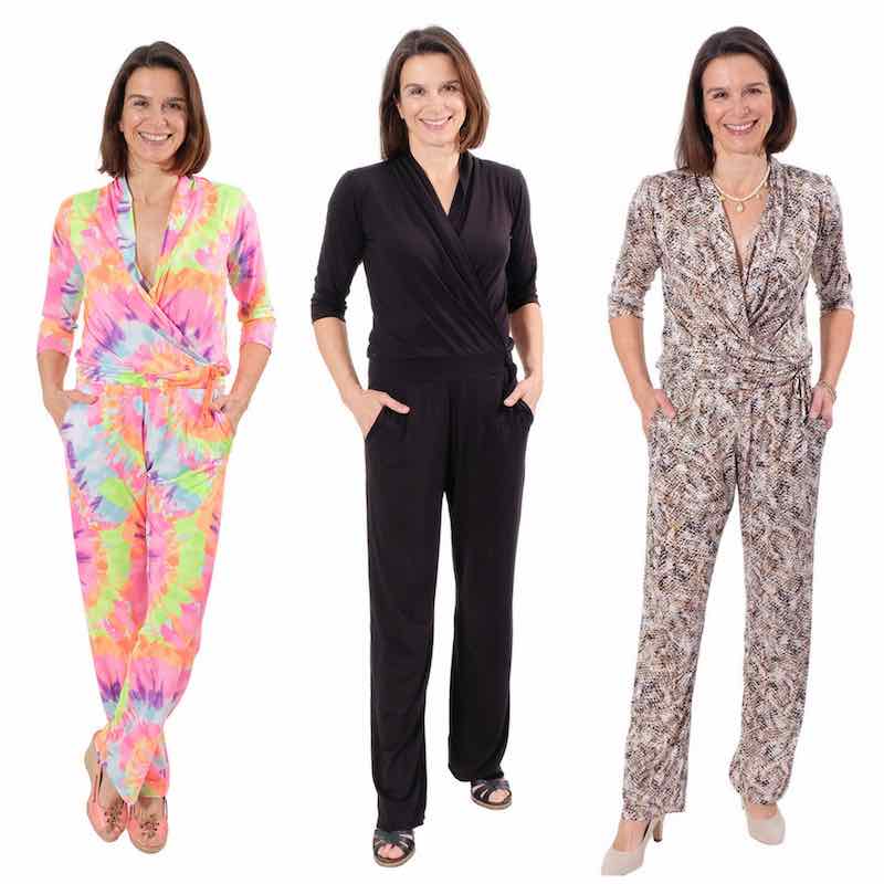 Dieser Jumpsuit mit seitlichen Taschen und Wickeloptik ist ein ganz besonderes Teil weil die Schnittführung außergewöhnlich ist. Der Style ist für viele Figuren sehr gut geeignet. Wichtig ist, dass die Stoffe weich und fließend fallen. Je nach Stoff und Verarbeitungsvariante bekommst Du gleich einen anderen Look. Für die kühleren Jahreszeiten kannst Du ganz einfach einen Cardigan dazu nähen! Und wer kreativ ist kann sich den Armausschnitt mit Schrägband versäubern und die Beine unten einkräuseln, siehe Beispiel aus grünem Bambus Jersey….