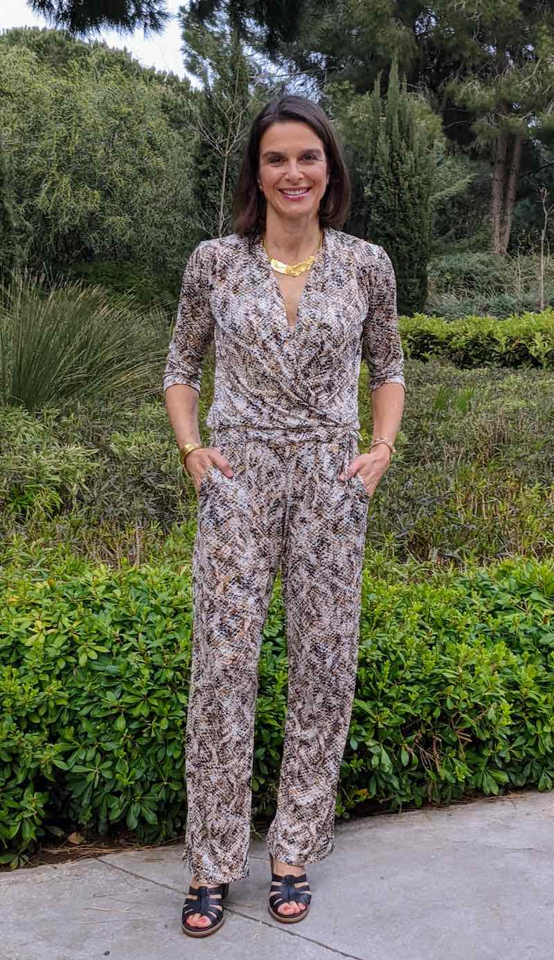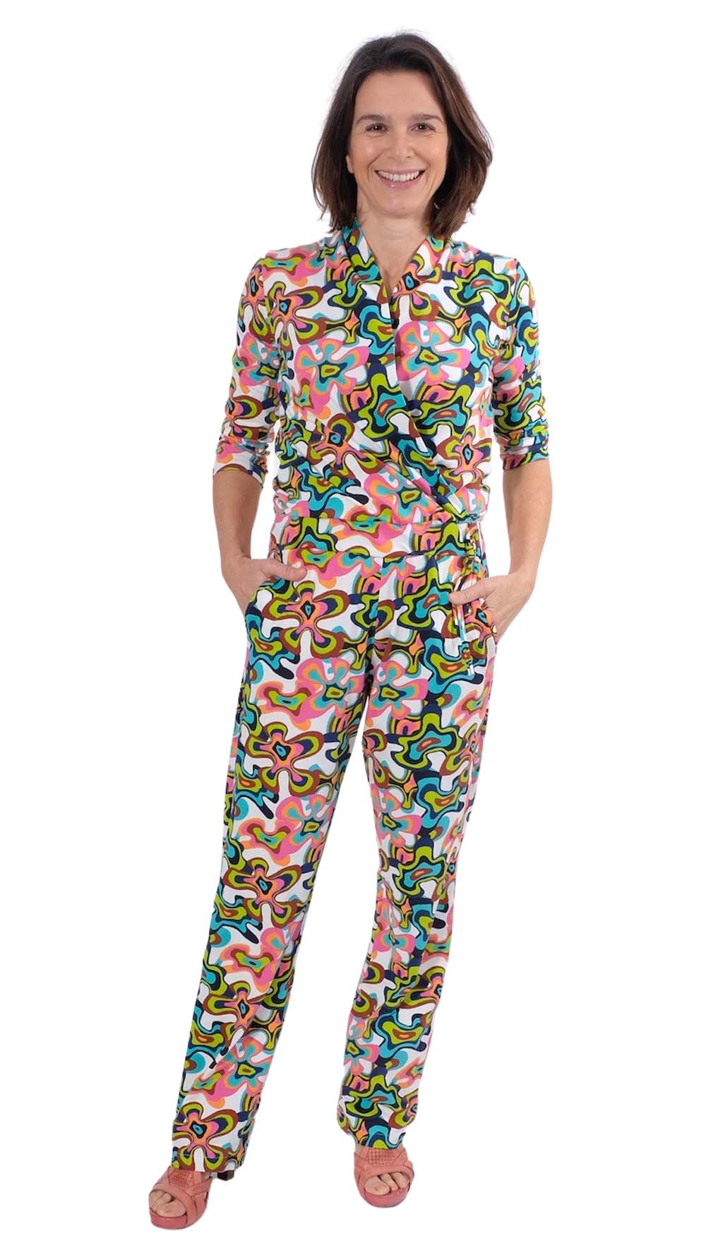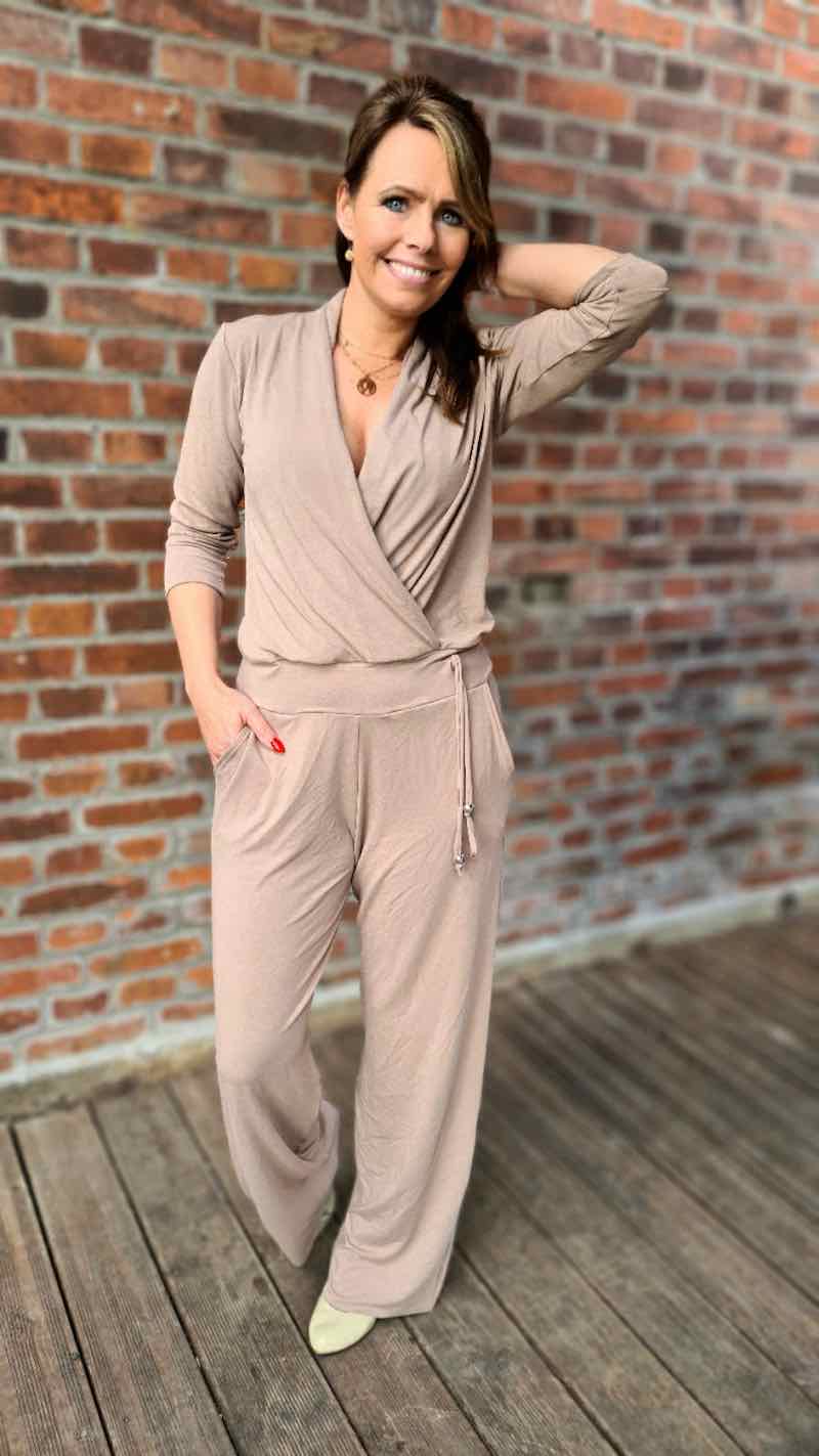 Dieser Jumpsuit mit seitlichen Taschen und Wickeloptik ist ein ganz besonderes Teil weil die Schnittführung außergewöhnlich ist. Der Style ist für viele Figuren sehr gut geeignet. Wichtig ist, dass die Stoffe weich und fließend fallen. Je nach Stoff und Verarbeitungsvariante bekommst Du gleich einen anderen Look. Für die kühleren Jahreszeiten kannst Du ganz einfach einen Cardigan dazu nähen! Und wer kreativ ist kann sich den Armausschnitt mit Schrägband versäubern und die Beine unten einkräuseln, siehe Beispiel aus grünem Bambus Jersey….