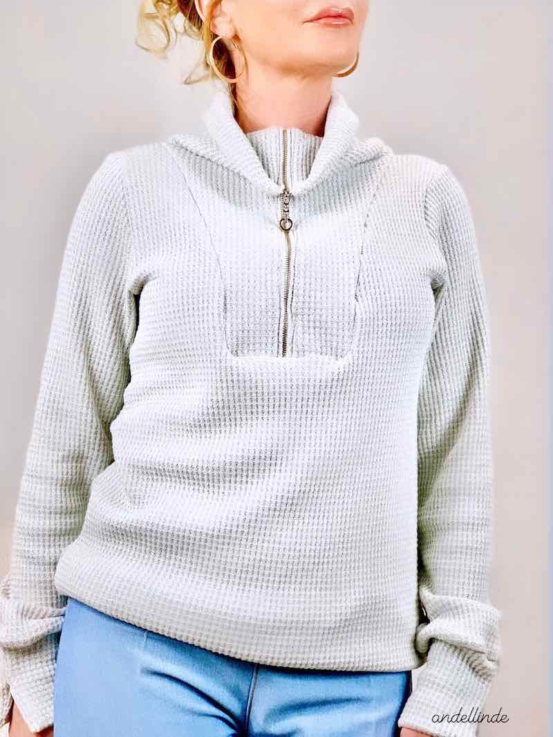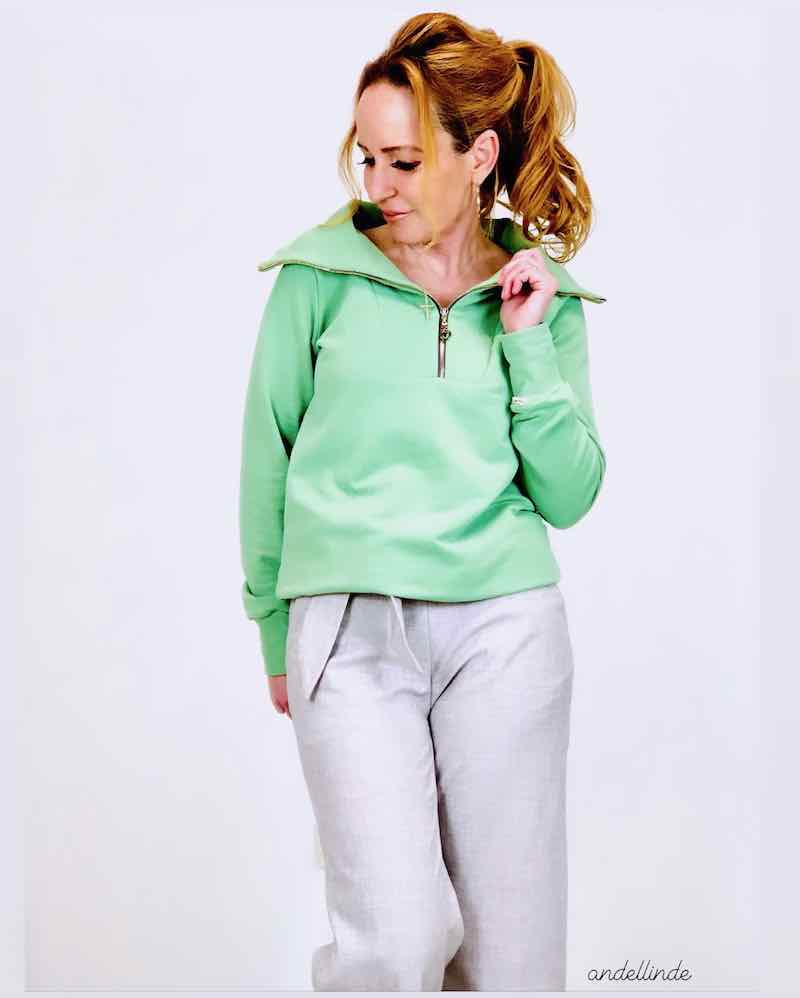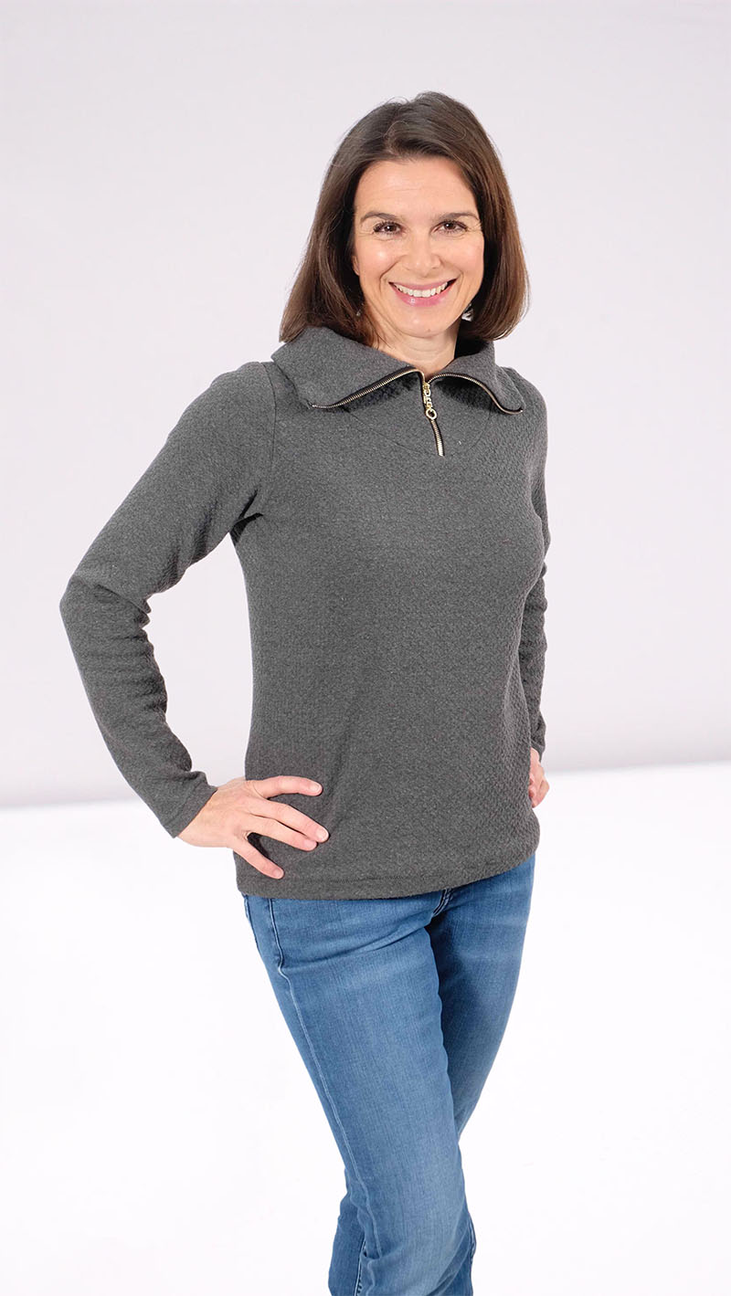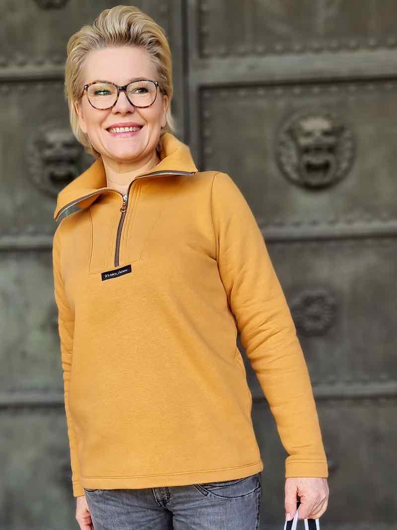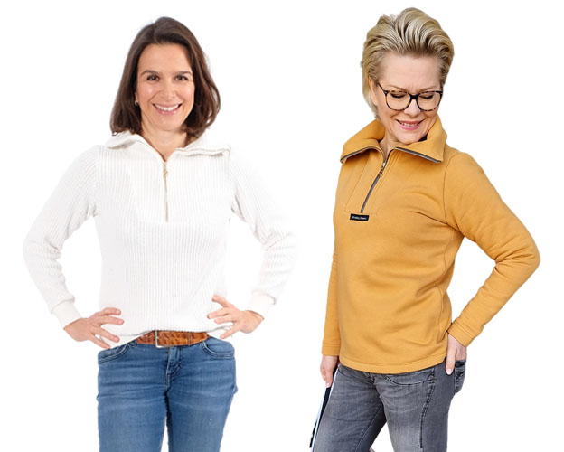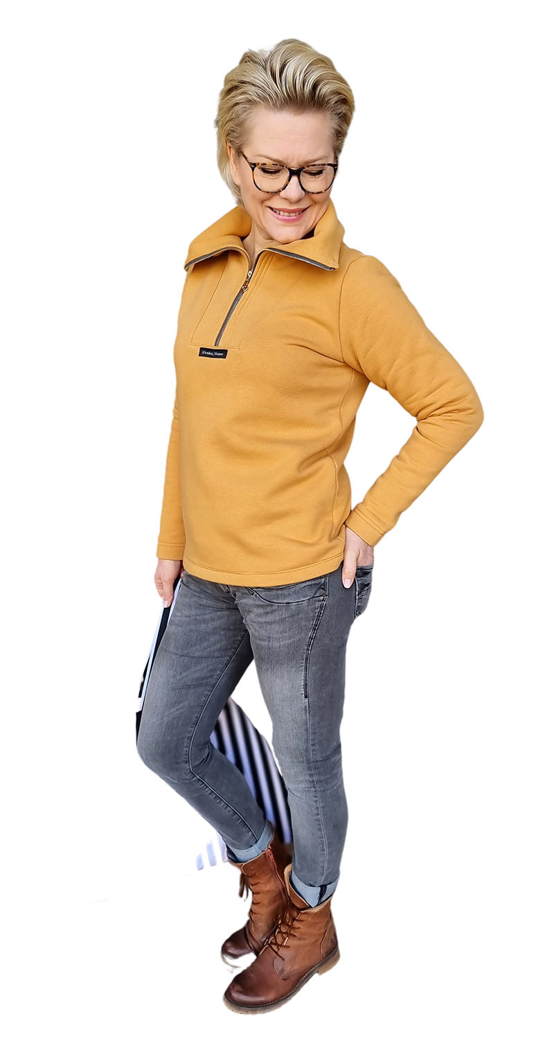 Ein schlichtes Shirt mit einem Troyer-Kragen. Du kannst das Shirt sportlich oder chic kombinieren, ganz nach deinem Geschmack. Den Kragen kannst Du in eckiger oder runder Variante nähen. Zudem sind im Schnittmuster 2 Varianten beinhaltet, einmal für die taillierte Form und einmal gerade geschnitten. Durch Collegebündchen und durch Absteppungen, Plots und Labels kannst Du deinen Troyer Pullover auch immer wieder neu aussehen lassen. Passende Reißverschlüsse findest Du hier.