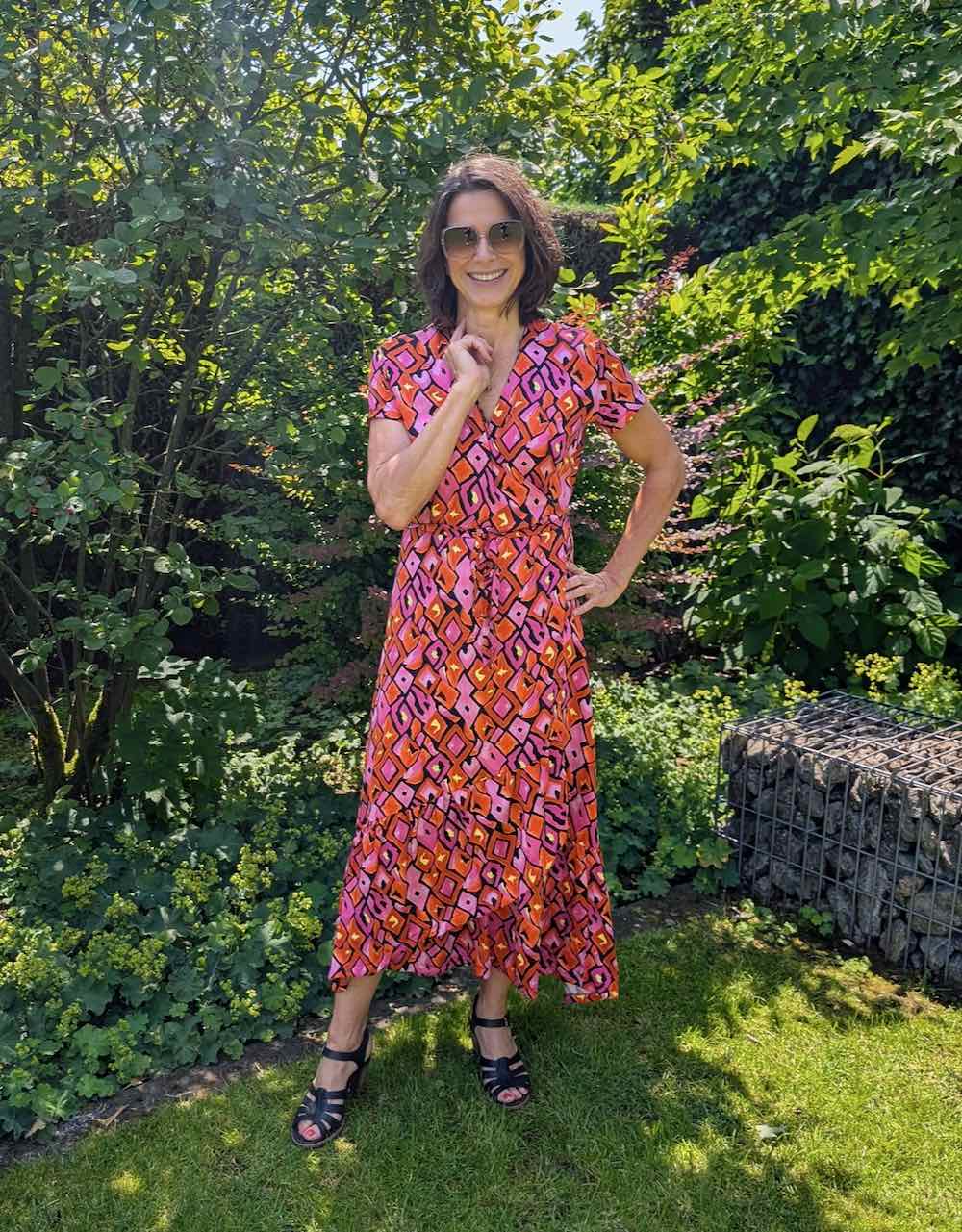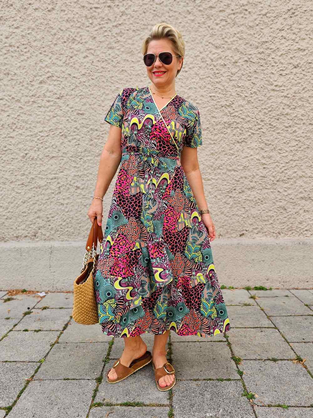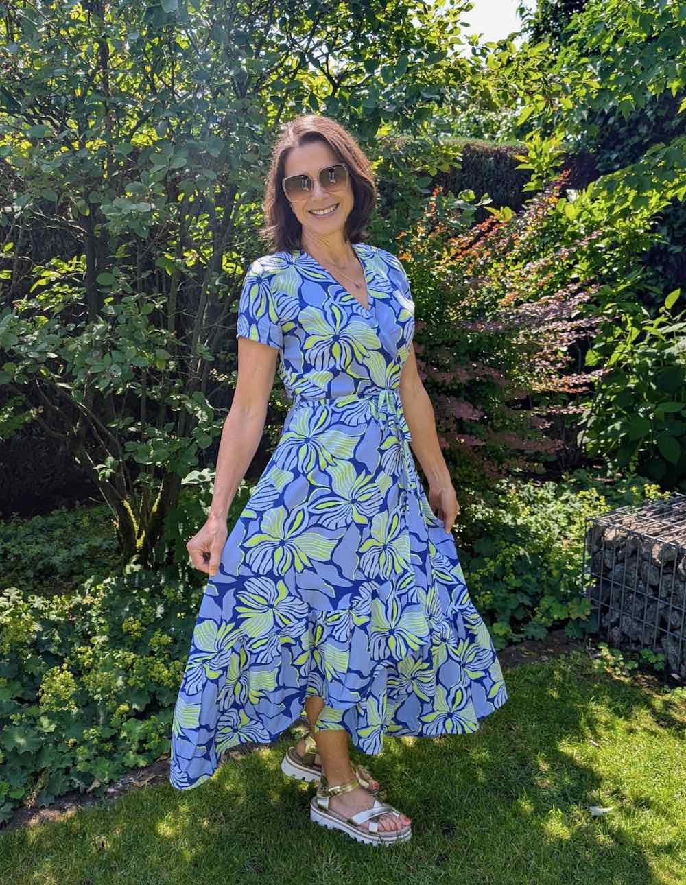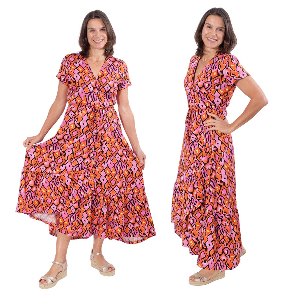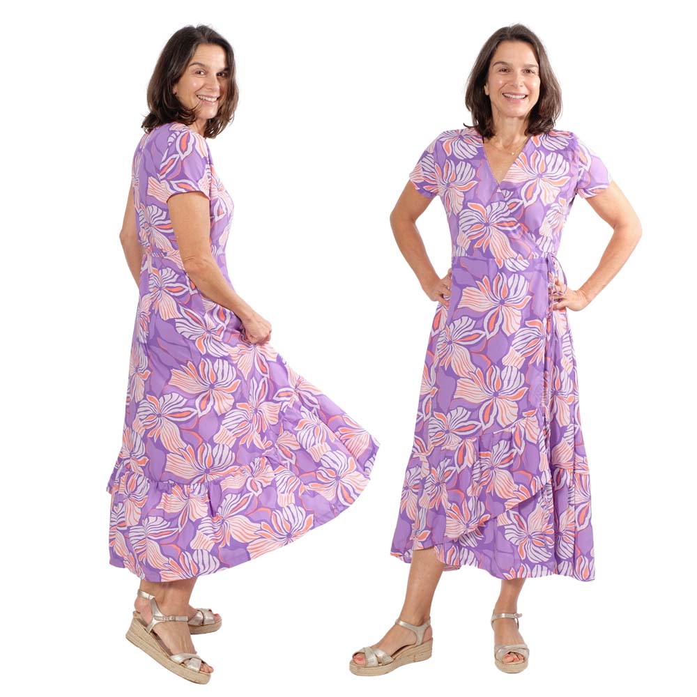 Ein wunderschönes Wickelkleidkleid mit kurzen Ärmeln und einem Rüschensaum. Das Kleid wird ohne Reißverschluss gearbeitet und nur mit Bändern gebunden.