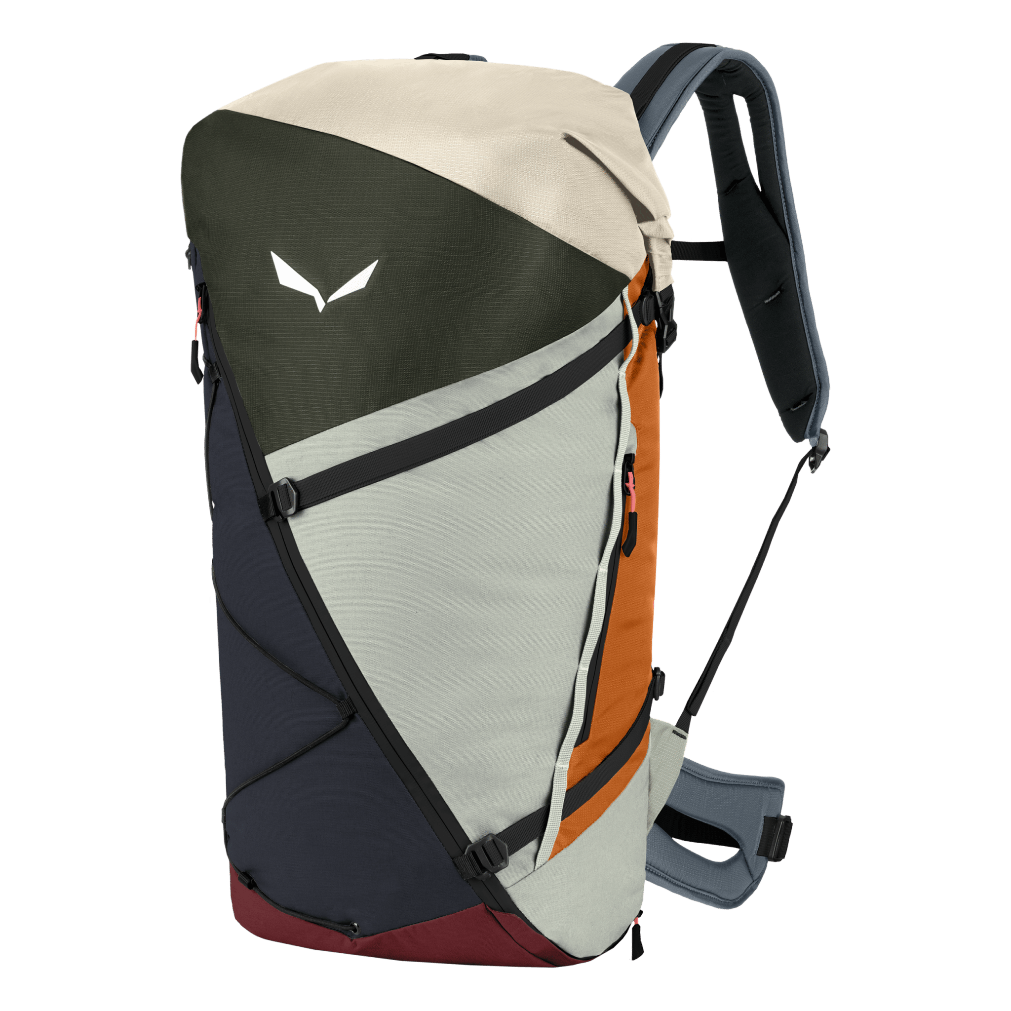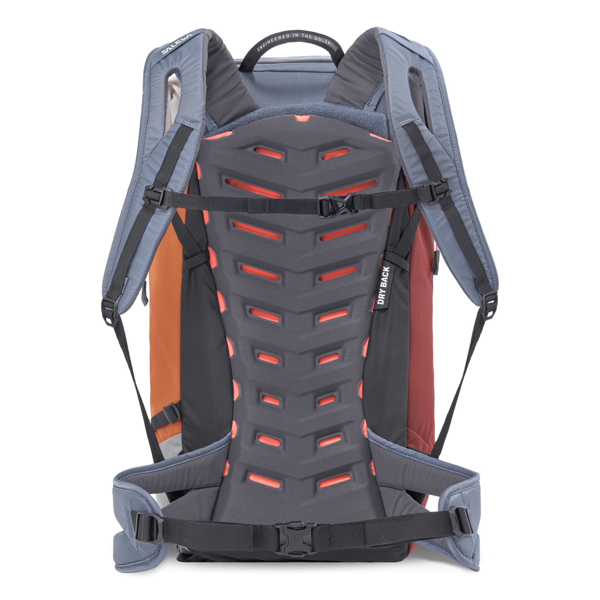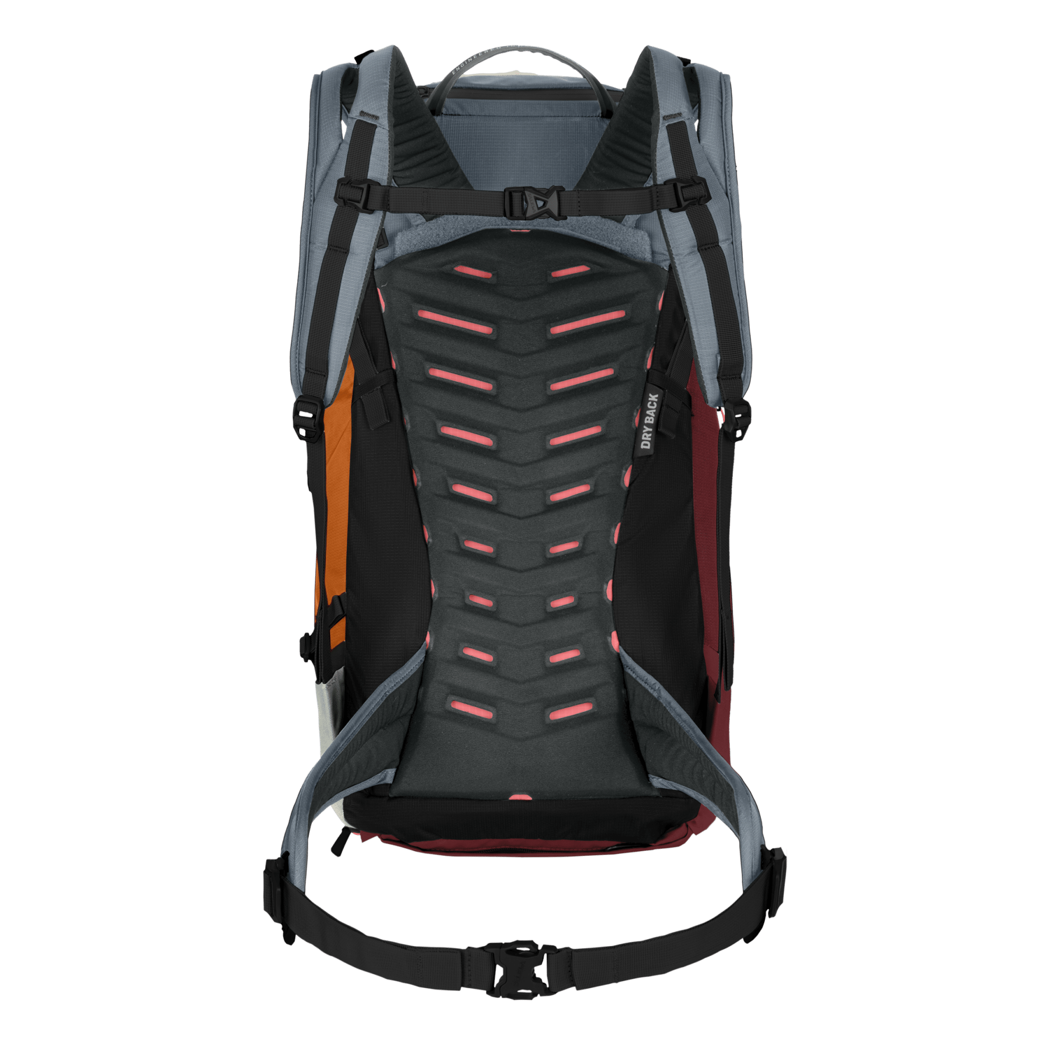 Das Dry Back Custom-Tragesystem wurde in Zusammenarbeit mit Bergsportlern und Alpinisten entwickelt und sorgt mit 3D-Belüftung und ergonomischen Schultergurten für eine bequeme Lastenverlagerung. Das System ermöglicht eine individuelle Anpassung der Rückenlänge und Passform. Für Stabilität sorgen auch die Lastkontrollriemen und der geteilte Hüftgurt.