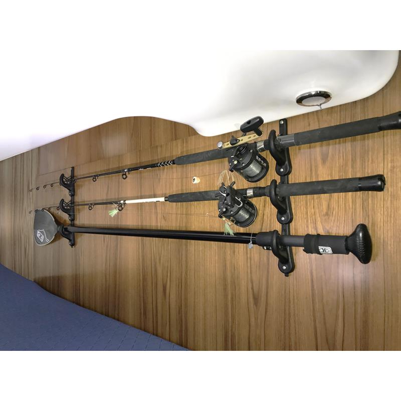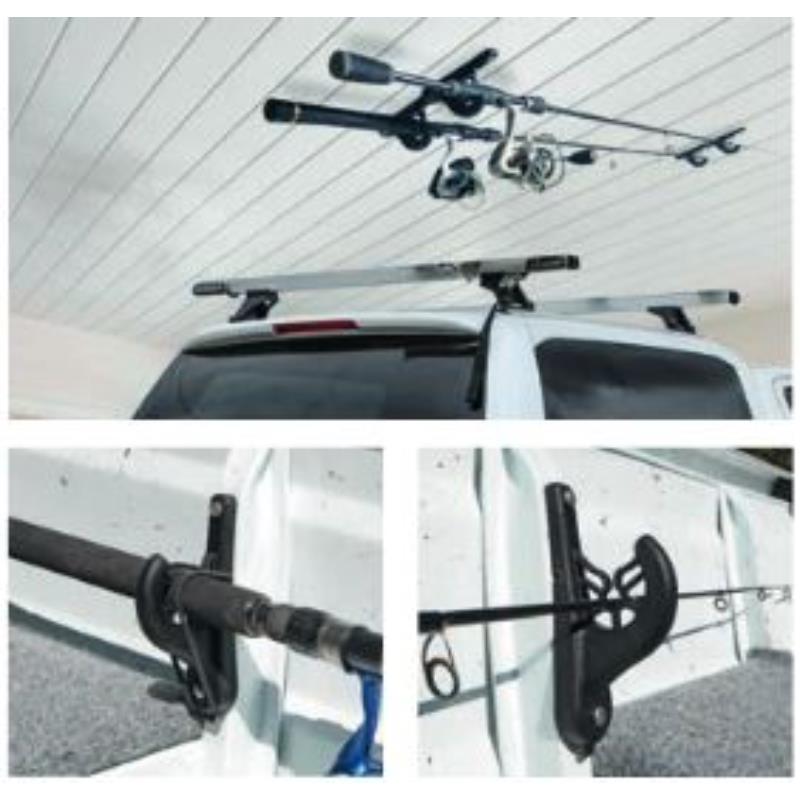 Klemmhaken-Paar für Angelruten zur Verstauung, mit unterschiedlichen Klemmkörpern aus Weichgummi zur Schonung der Ruten. Die Ruten können vertikal oder horizontal oder z.B. in einer Garage auch überkopf aufbewahrt werden. Für Rutengriffe von 25-38 mm.