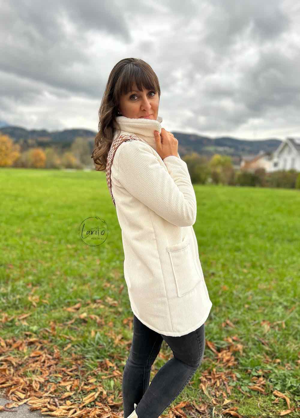 Dieser kuschelige Stoff ist ideal für Jacken, Mäntel und Westen. Außen ist er wie ein Rippenjersey, von innen wie ein Teddystoff gearbeitet. Abbildung Schnittmuster Gesa. Auch Deko Kissen oder Decken kann man hier sehr gut daraus nähen. Bei Jacken lieber eine Nummer größer wählen, der Stoff schluckt nämlich etwas Weite.