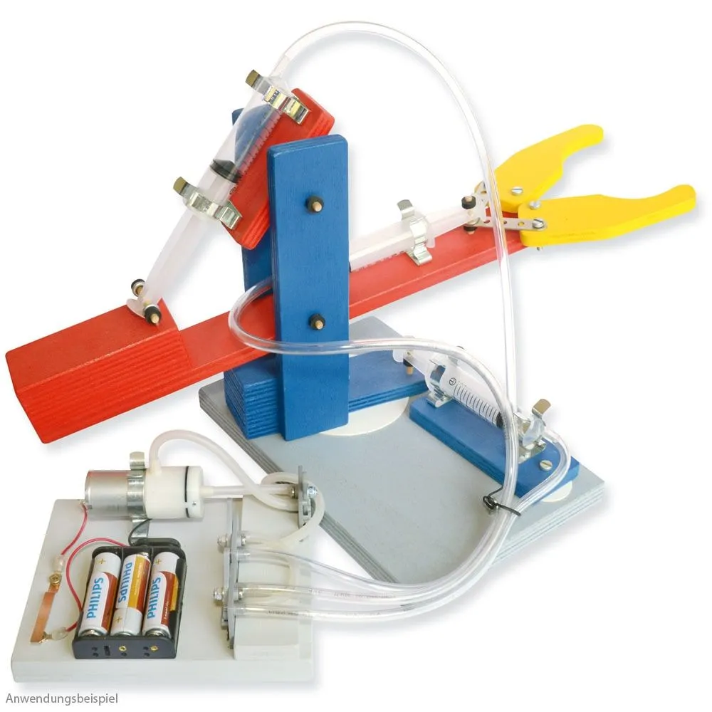 • Realitätsnah mit leistungsstarkem E-Kompressor (4,5 V) die Saug- und Druckfunktion kennenlernen und erforschen. Mit drei Umschaltventilen folgende Bewegungen ausführen: Arm heben/senken – Arm schwenken – Greifer öffnen / schließen