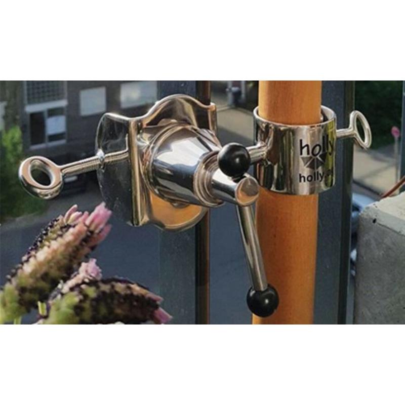 Polierter Edelstahl • Sonnenschirmhalter • für Schirmstöcke bis 38 mm Ø • Montage an Geländern, Relingen, Brüstungen • Gelenk.