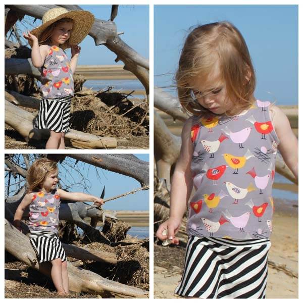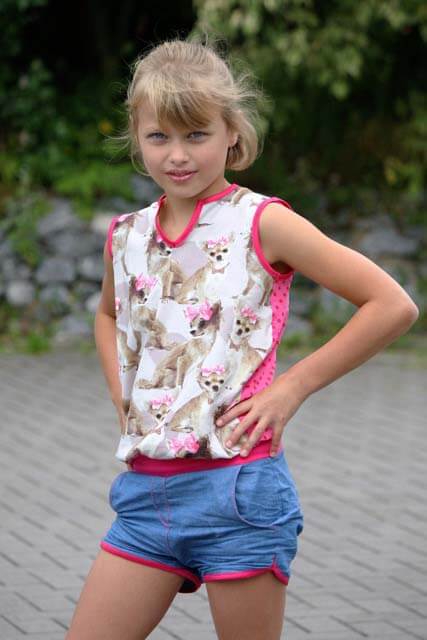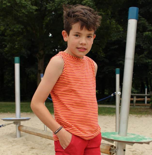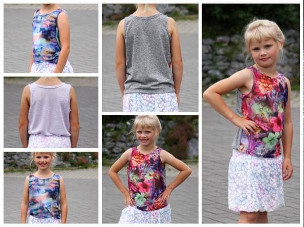 Der Schnitt ist für Jungen und Mädchen geeignet. Ob mit einem Body bzw. T-Shirt darunter oder im Sommer als ärmelloses Shirt, die Einsatzmöglichkeiten sind vielfältig. Das Shirt ist leger geschnitten und kann daher ganz lange getragen werden. Ein schönes Nähprojekt für alle, die noch nicht viel Jersey genäht haben. Wer es sommerlich haben möchte kann sich das Shirt kürzen und mit einem Gummiband als Abschluss versehen. Die Gestaltungsmöglichkeiten sind vielfältig. Wie eng das Shirt am Ende sitzen soll kann jeder selber bestimmen. Im Schnittmuster sind 2 Versionen mit Flügelärmelchen enthalten, somit könnt Ihr das Schnittmuster also als Tank Top oder als T-Shirt nähen. Das elastische Band für den Ärmel-Saumabschluss gibt es hier.