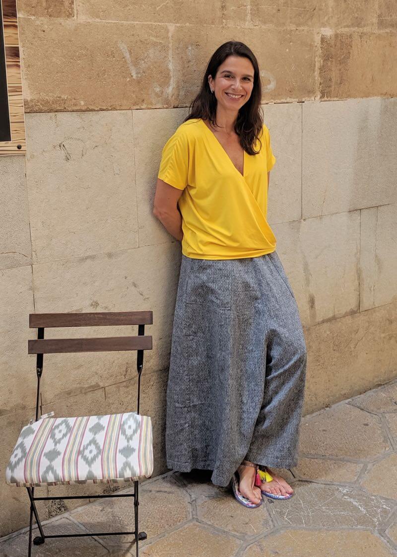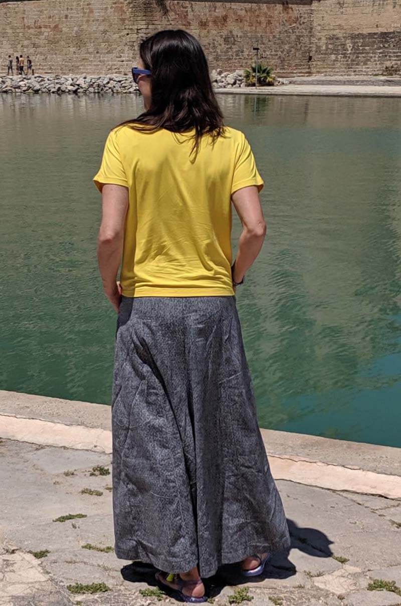 Materialempfehlung: Das Modell kann aus allen durchgefärbten oder garngefärbten Jersey Stoffen genäht werden, da die linke Stoffseite sichtbar sein wird. Sie sollen leicht fallen, zu schwere Stoffe eignen sich nicht.