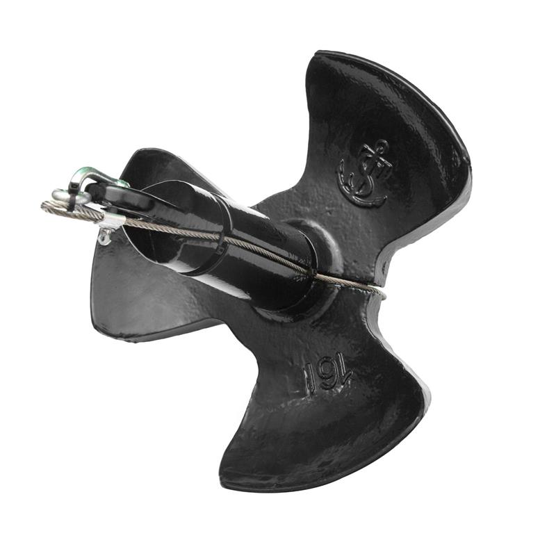 Länge: 215 mm, Trenddurchmesser: 290 mm, Spindel mit 50 mm Durchmesser, Gewicht des Ankers: 8 kg. Die Bruchlast des Sicherheitsseils beträgt 150 kg.