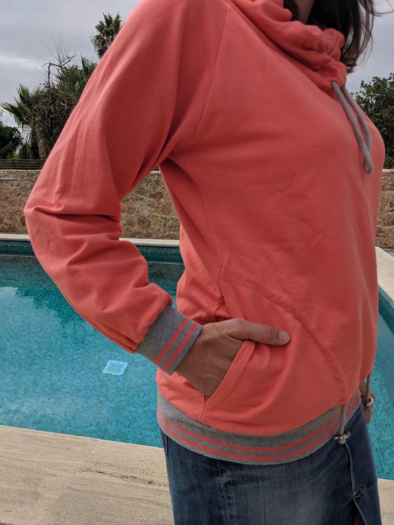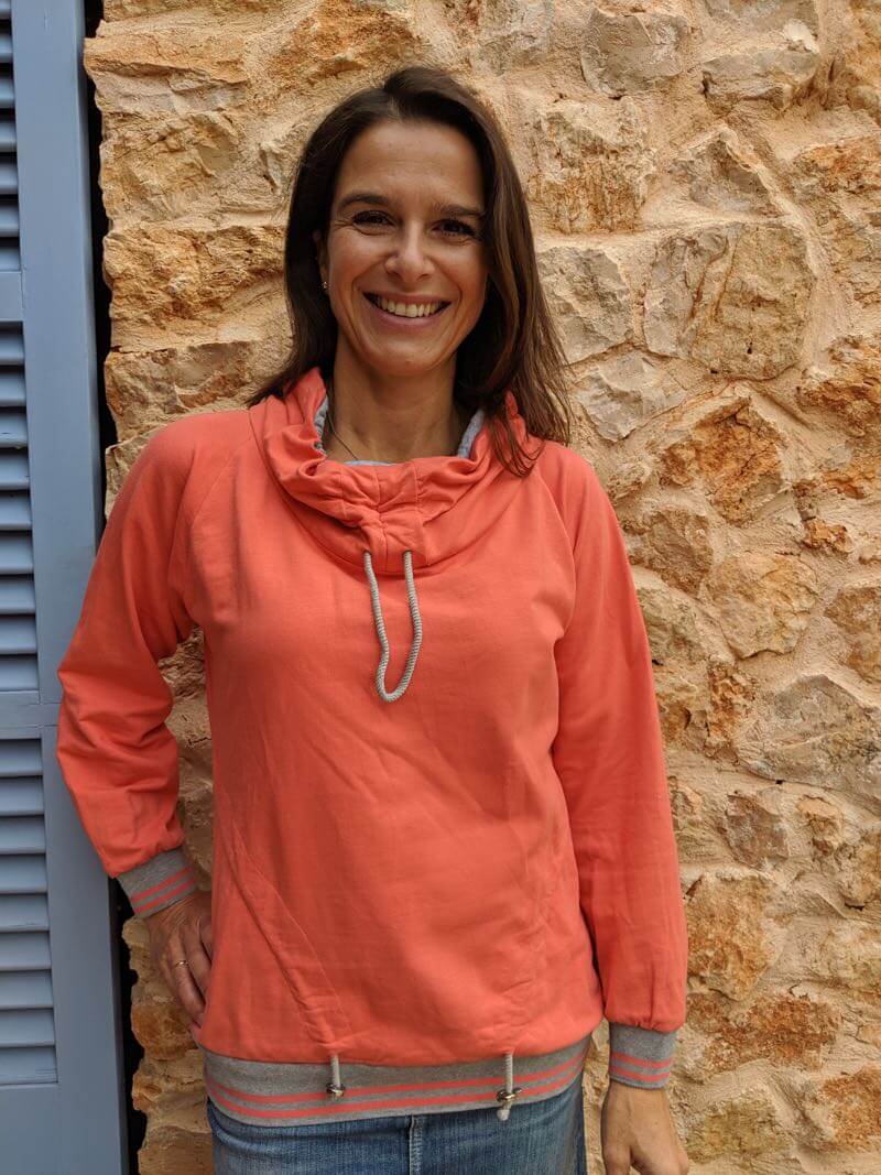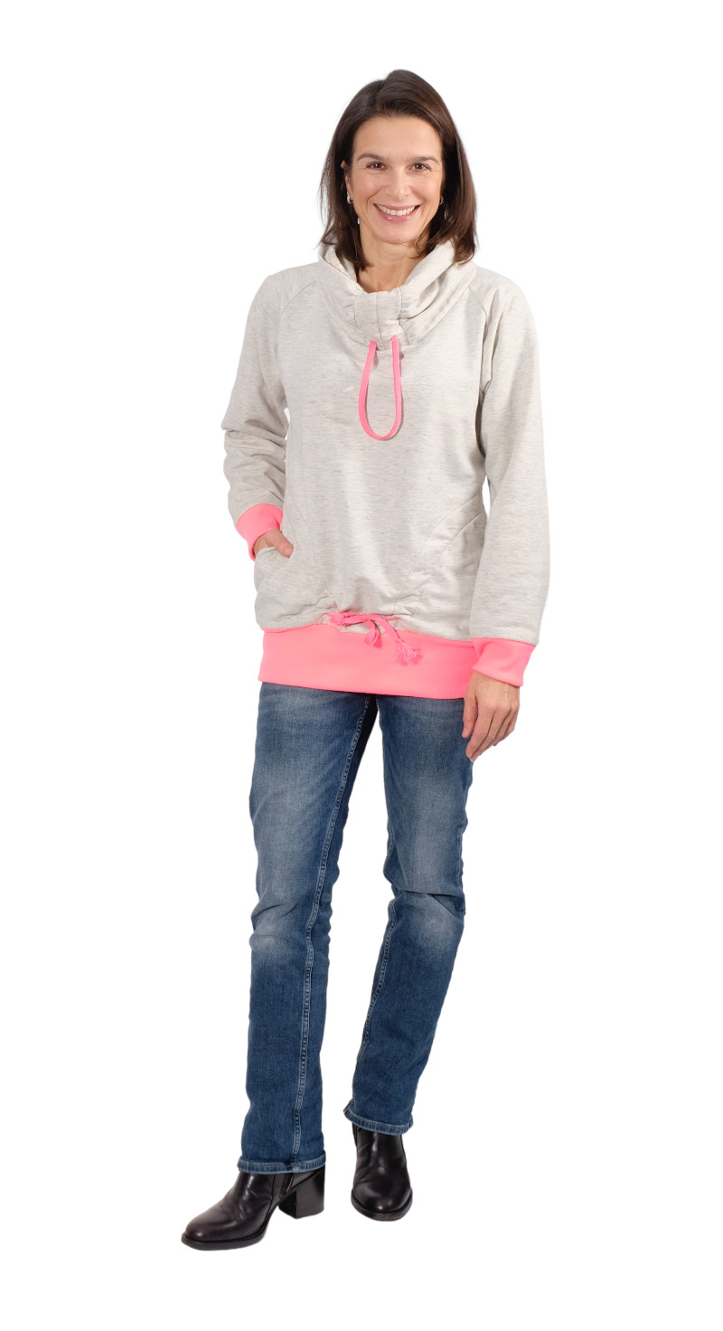 Dieses wunderschöne Sweatshirt sieht aus wie ein Hoodie, ist aber keines. Es ist mit seiner raffinierten Kragen – und Taschenlösung ein besonderer Hingucker. Wenn Du schon ein wenig Näherfahrung hast, sollte das Shirt für Dich kein Problem sein. Es gibt aber auch ein passendes Video dazu, in dem wir die Schritte ausführlich erklären.