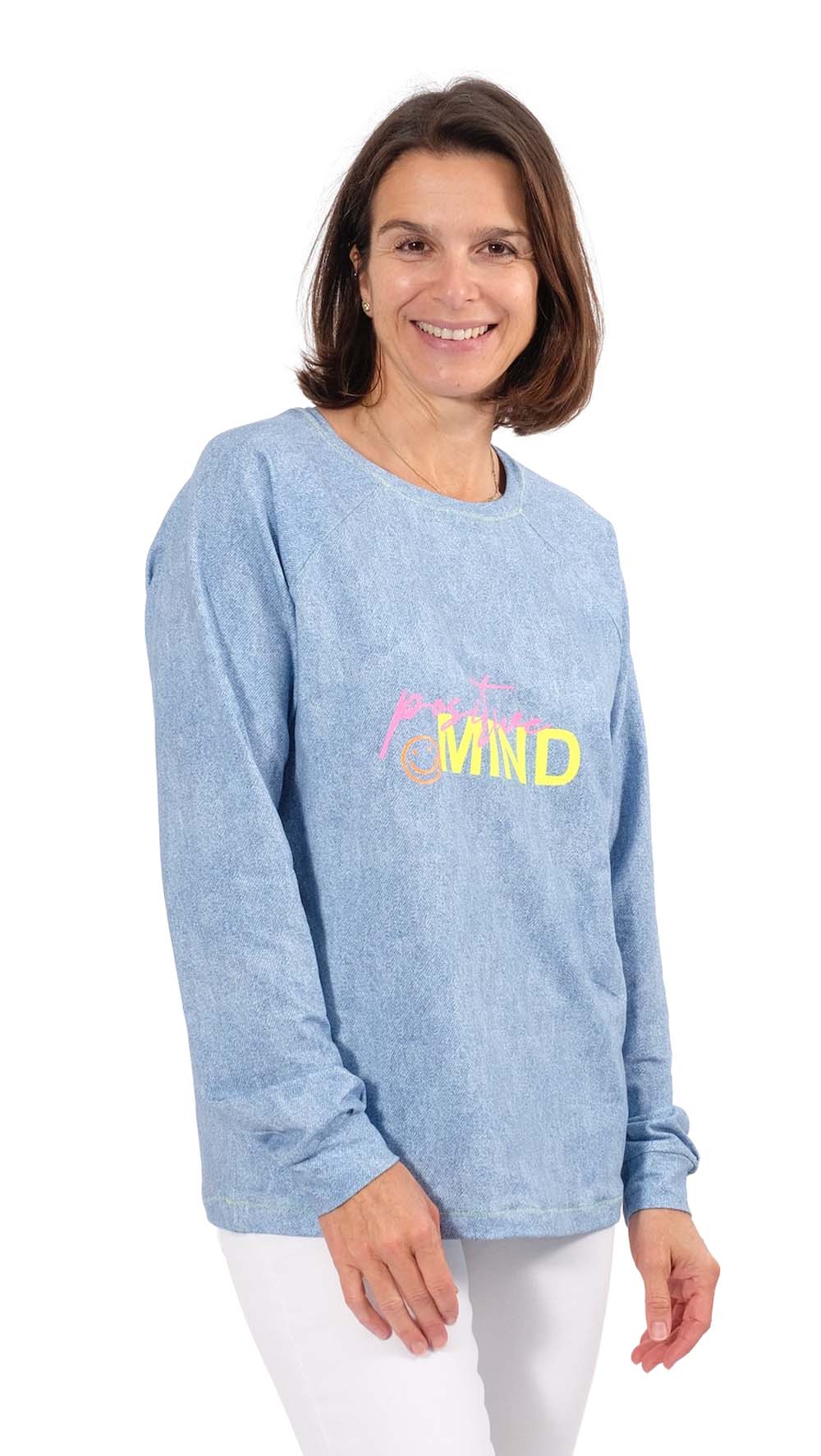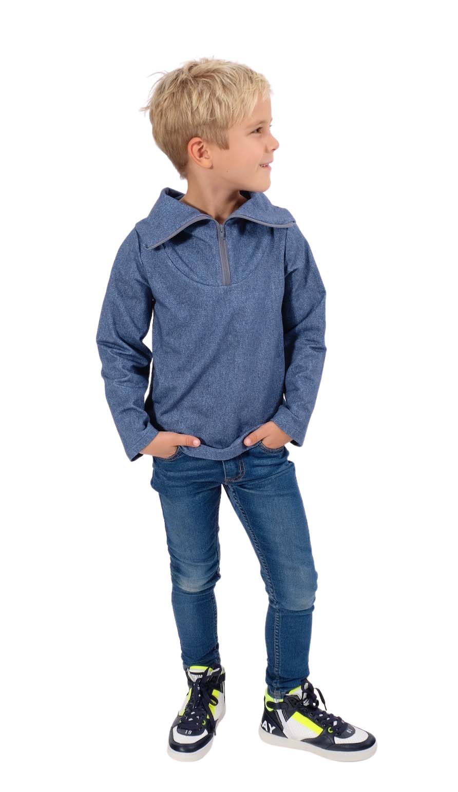 Eine wunderschöne “Sommersweat” Sweatshirt Qualität in Jeansoptik. Ideal für Mützen, Schals, Oberteile, Jacken, Kleider, Röcke und vieles mehr. Die Rückseite ist nicht angeraut sondern weist die typische Schlingenstruktur auf. Abbildung Schnittmuster Raglanshirt Beata, Zita Troyer Pullover in dunkel, Nike und andere Schnittmuster zur Inspiration.