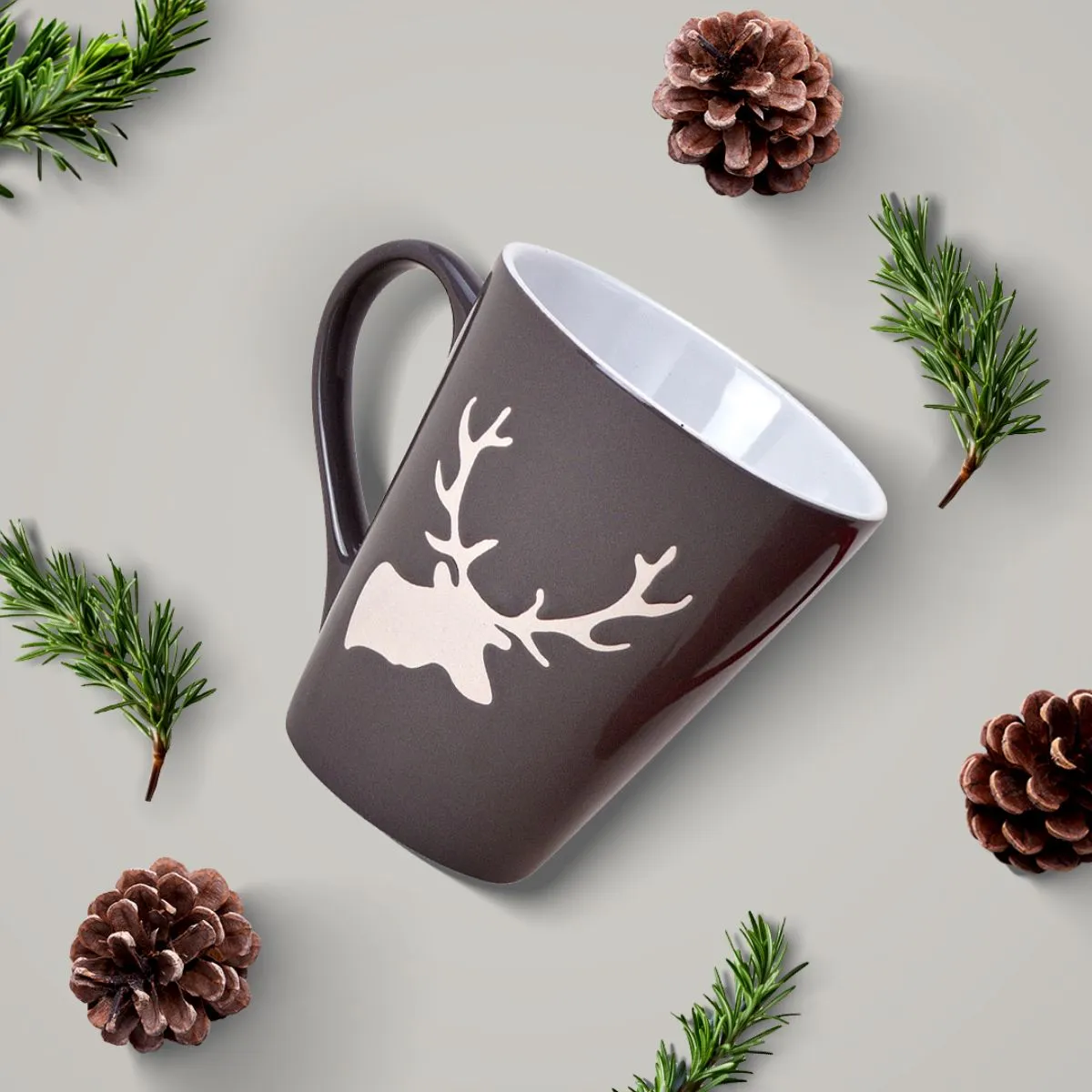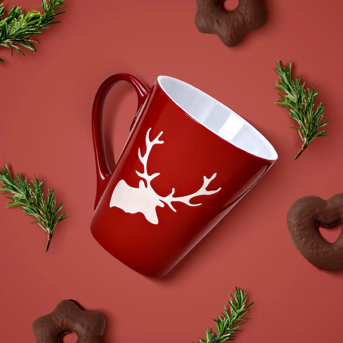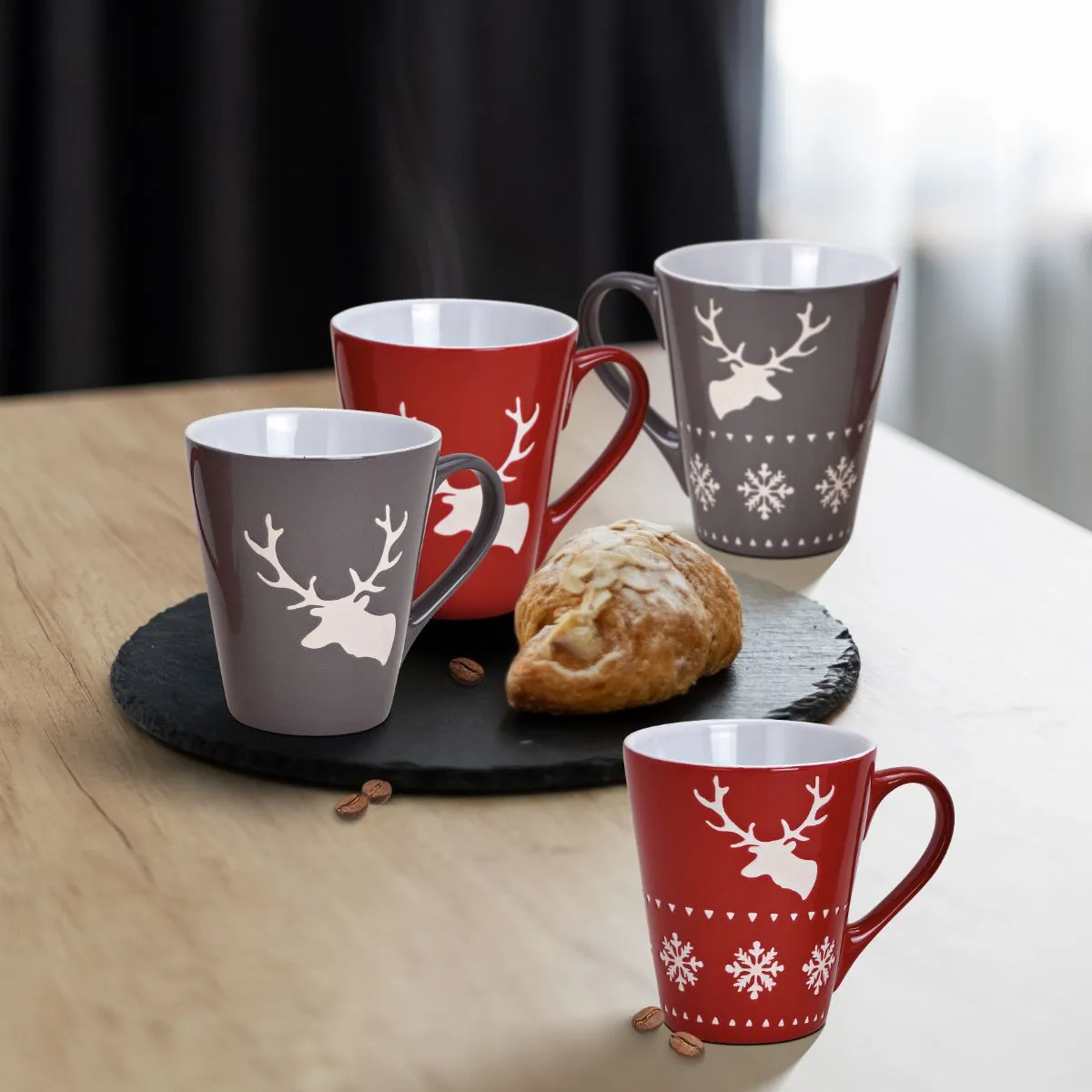Tassen 4er Set Xmas in grau und rot – Amerikanische Keramik Kaffeebecher als Weihnachtstassen in 10 cm – Hirsch Dekor Kaffeetassen für Weihnachten spülmaschinenfest und mikrowellengeeignet