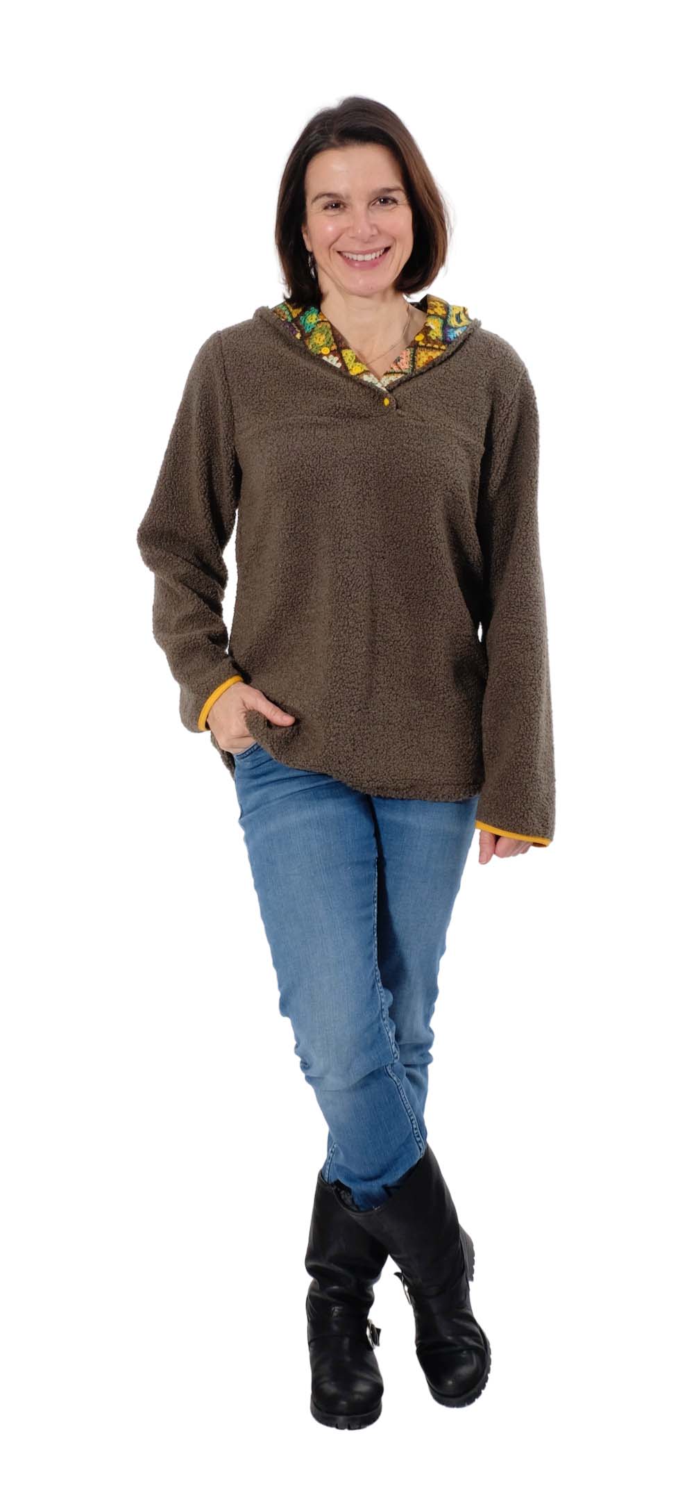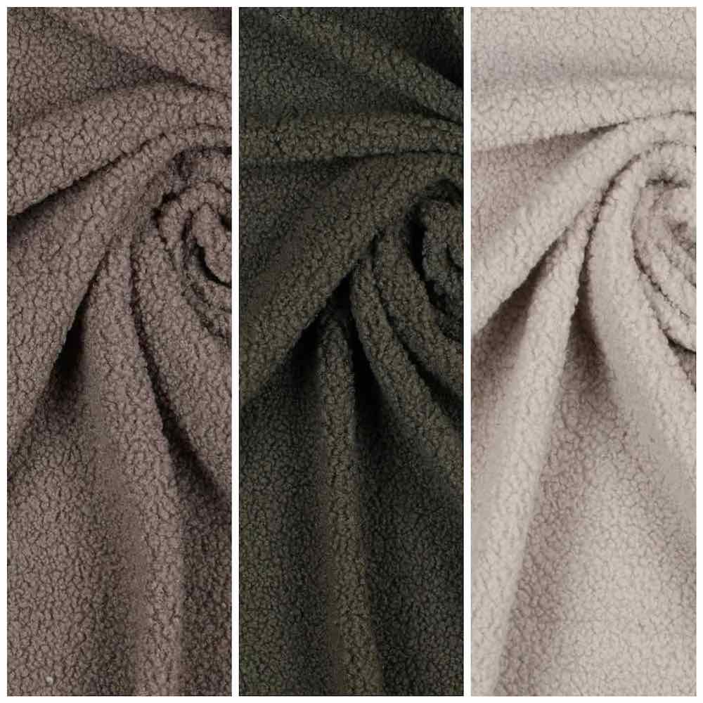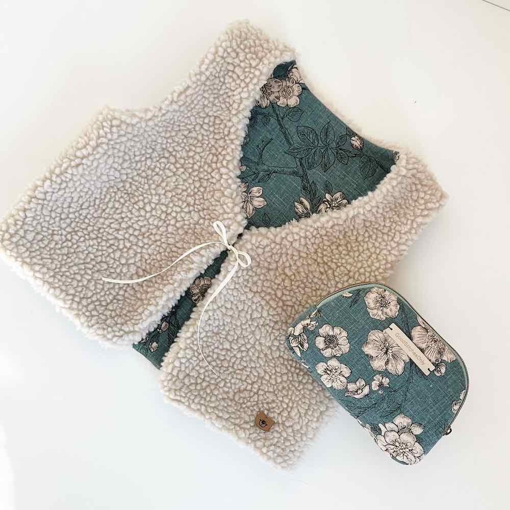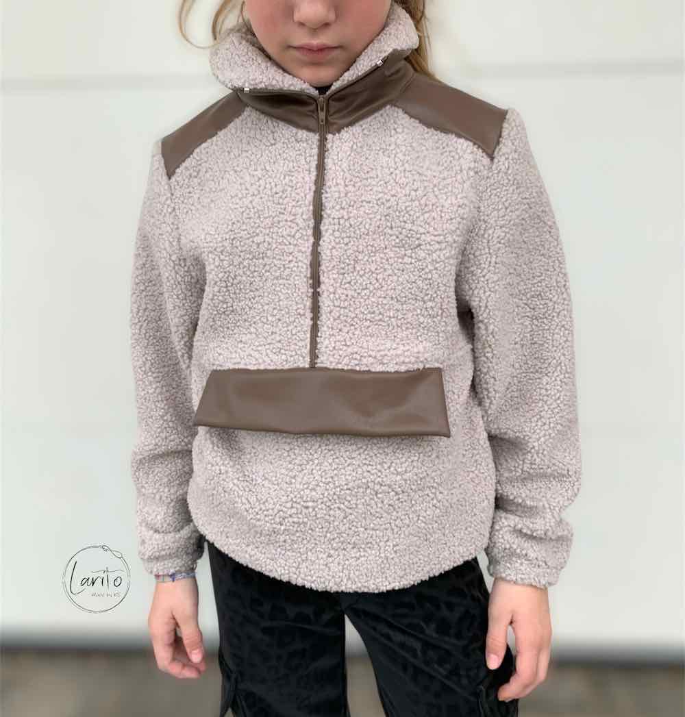 Ein sehr weich fallender aber “dickerer” Teddy Stoff, ideal für Babyanzüge, Strampler, kuschlige Shirts / Hoodies und Troyer Pullover. Abbildung Schnittmuster Weste Flori und Pullover Emil und Troyer Reesa.