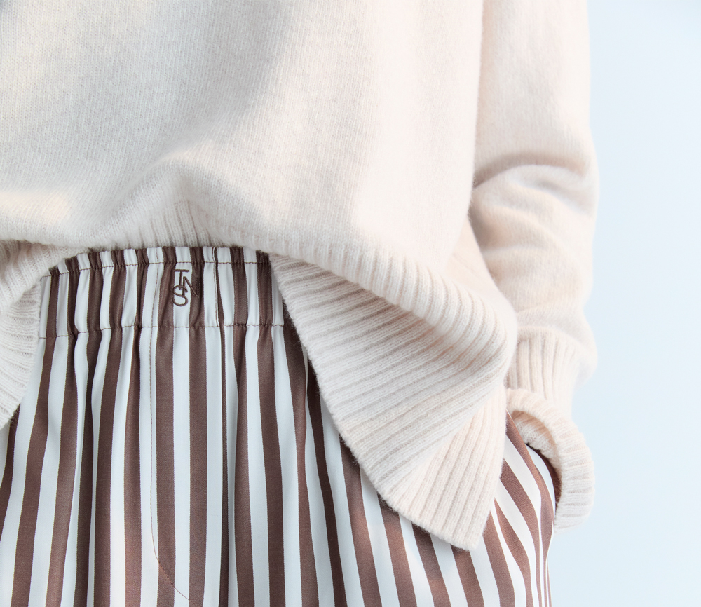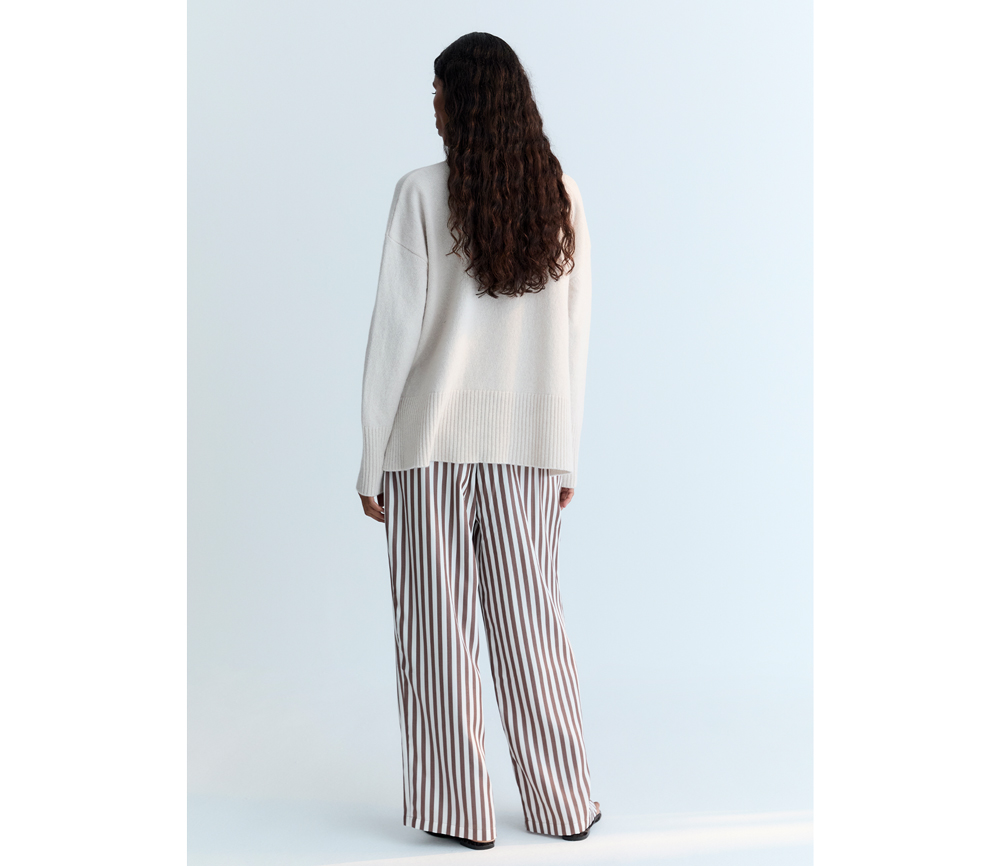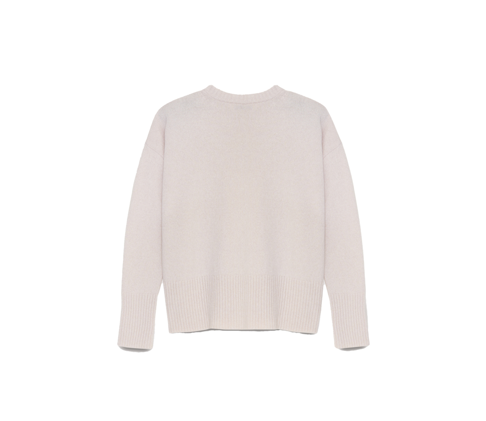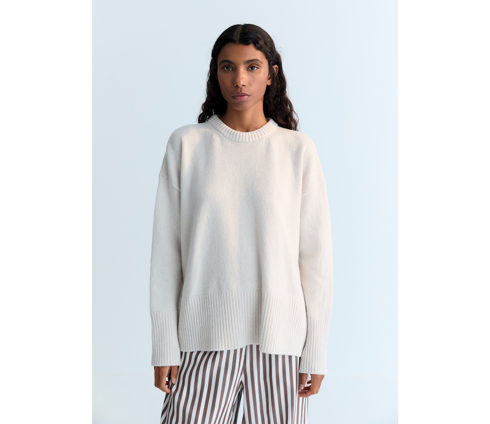 Ein luxuriöser Kaschmirpullover mit klassischem Rundhalsausschnitt und breiten Rippbündchen an Bündchen und Saum für ein edles Finish. Seitenschlitze sorgen für einen dezenten Hauch von Leichtigkeit und Bewegungsfreiheit und machen ihn sowohl bequem als auch stilvoll für den Alltag.