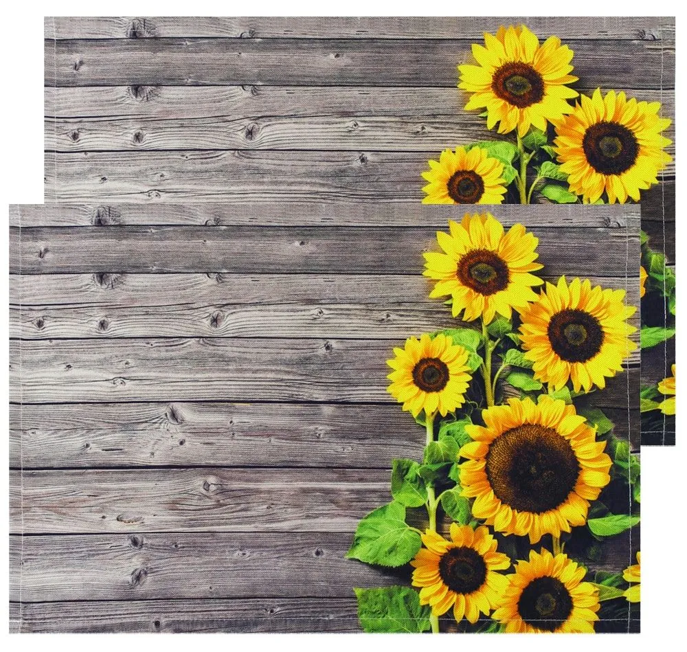 - Platzsets aus gewebtem Stoff, bedruckt mit wunderschönen Sonnenblumen vor einer dunklen Holzwand – bringt einen direkt zum Strahlen