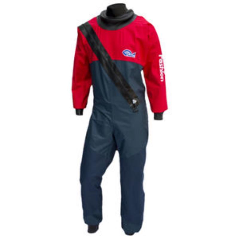 Trockenanzug aus 200DOX Nylon mit spezieller Weichbeschichtung • Knie- und Gesäßverstärkung aus 600D Polyester • Latex Hals-, Arm- und Fußmanschetten • RV-Innentasche und Hosenträger • T-ZIP Reißverschluss.