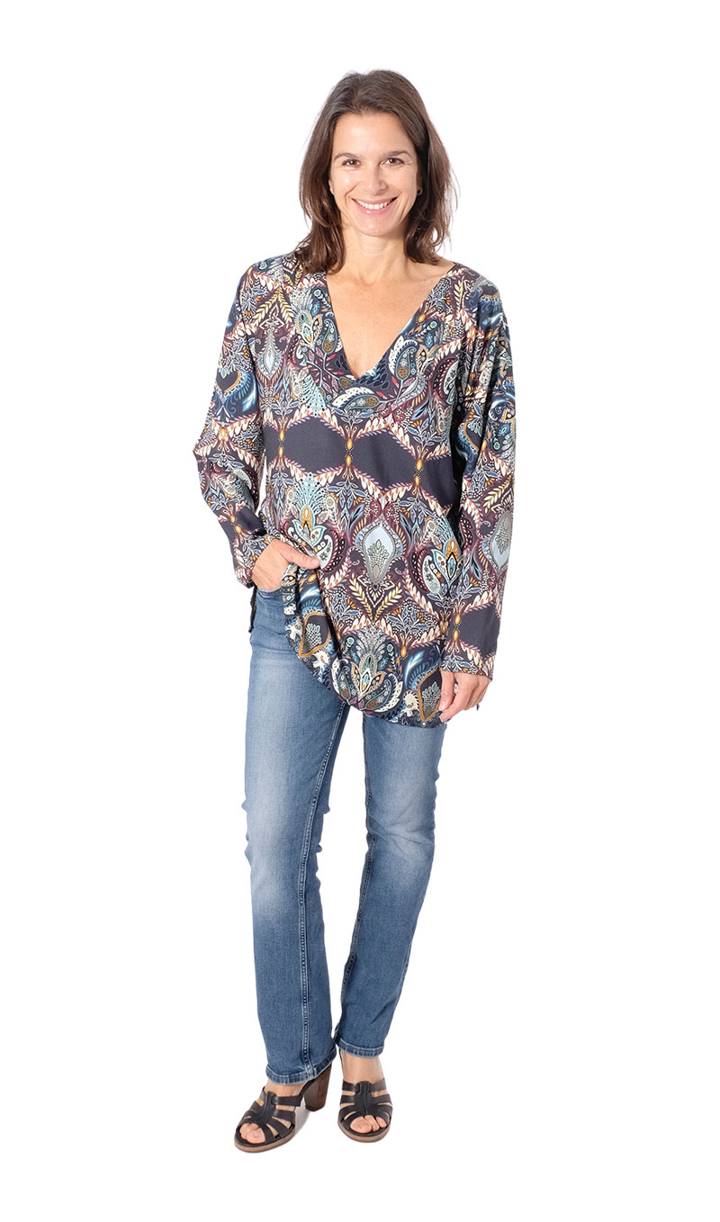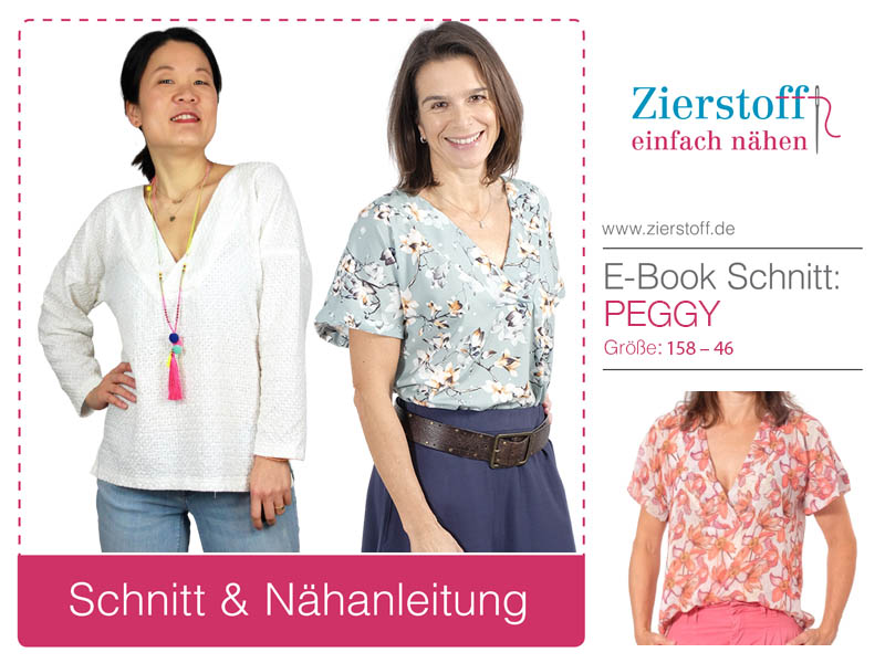 Eine einfache Tunika mit einem raffiniert tiefen Ausschnitt. Dieser Schnitt ist für Fortgeschrittene zu empfehlen. Je nach Stoff und Verarbeitung wird Peggy immer wieder anders aussehen. Ob als Kleid, lange oder kurze Bluse oder als Blusenshirt, hier kannst Du kreativ werden! Wir haben auch noch eine einfache Version mit V-Ausschnitt beinhaltet.