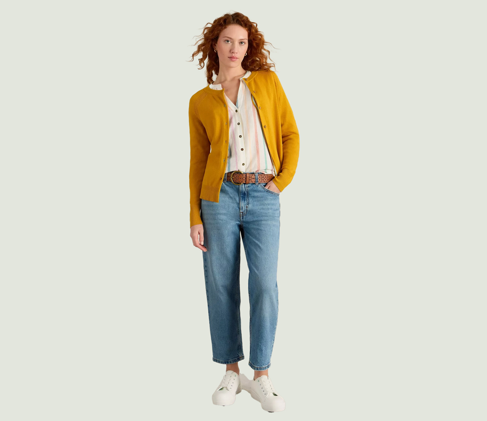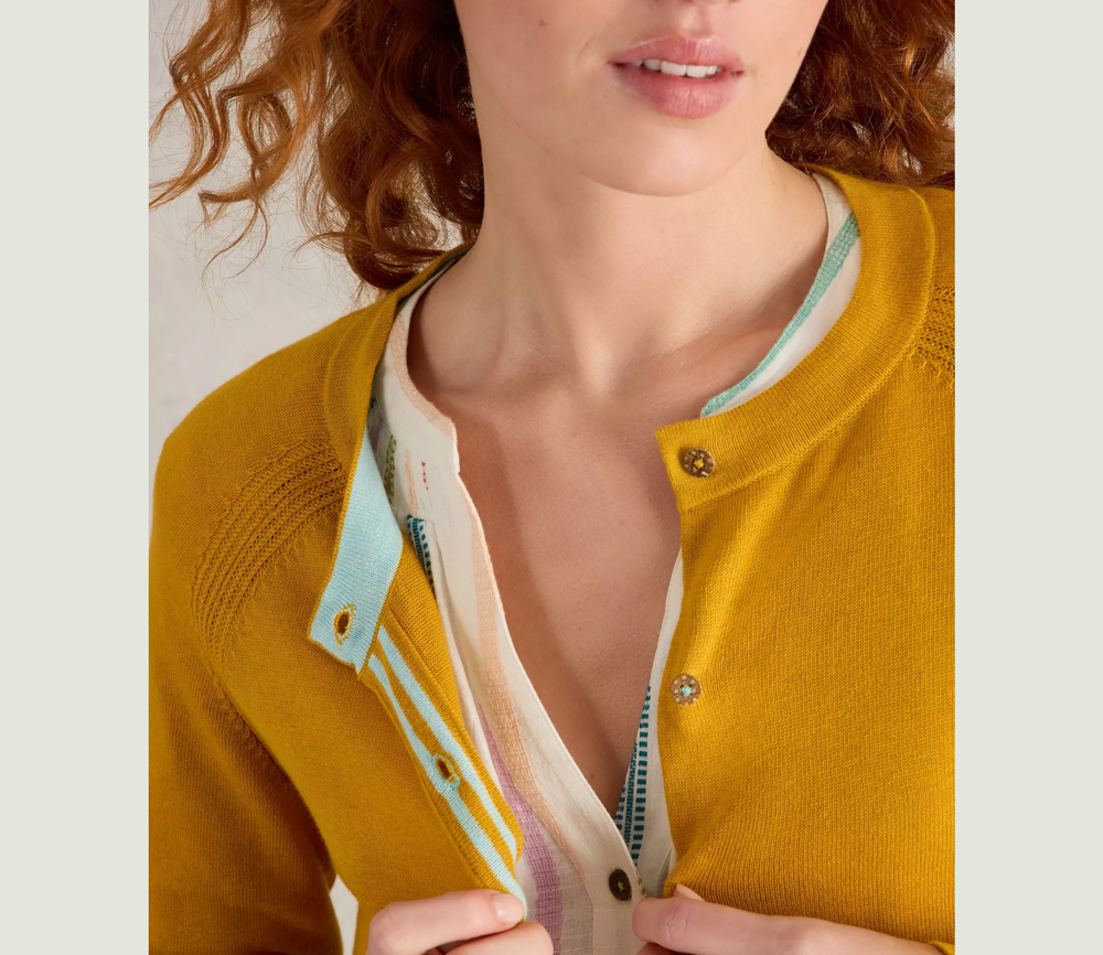 Diese Strickjacke aus Bio-Baumwolle ist leicht genug, um sie immer dabei zu haben, und warm genug, um an kühleren Abenden zu wärmen. Dafür lieben wir sie.