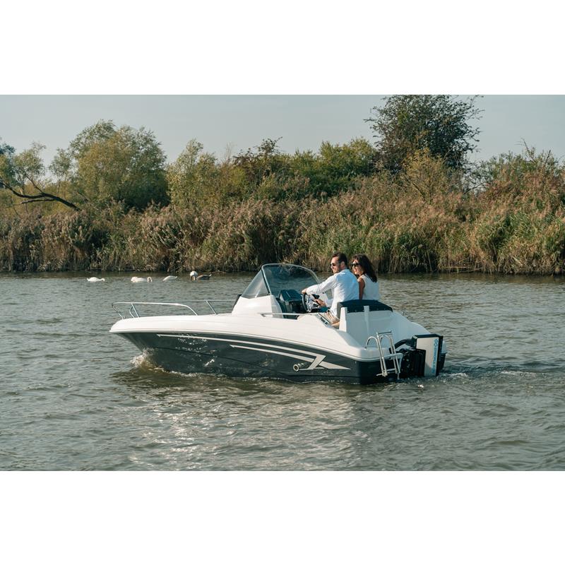 Das schmale Profil und das Fehlen einer externen Lenkmechanik maximieren den wertvollen Heckbereich, was mehr Platz zum Ein- und Aussteigen, Schwimmen und Verweilen bietet. Lenkung, Trimmen/Kippen, ECU (elektronische Steuereinheit) und Motorsteuerung sind in einer Einheit integriert.