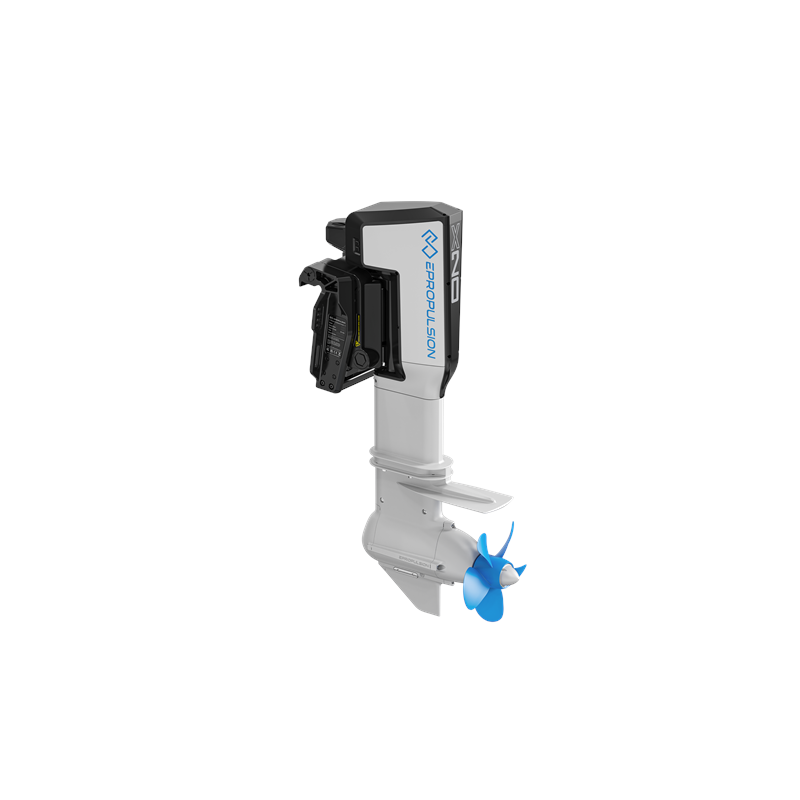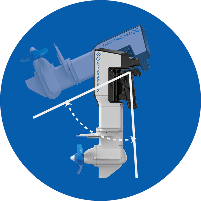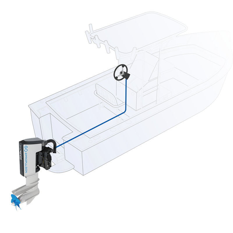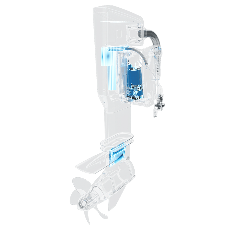 Kompaktes und vollständig integriertes, platzsparendes Design. Die schmale Befestigung mit interner elektrischer Lenkung sorgt für mehr Platz. Die elektrische Lenkung, die Servotrimmeinheit, die ECU (elektrische Steuereinheit) und die Motorsteuerung sind alle in einer Einheit integriert. Fortschrittliches Propellerdesign Unerreichte hydrodynamische Leistung und höhere Effizienz.